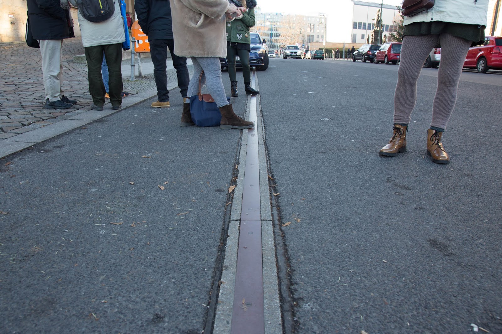 Fíjense la «linea» que hay en el piso en la foto de arriba y abajo. No es coincidencia. Esta es una línea que nos muestra por donde pasaba el muro y si la siguen pueden atravesar toda la cuidad.