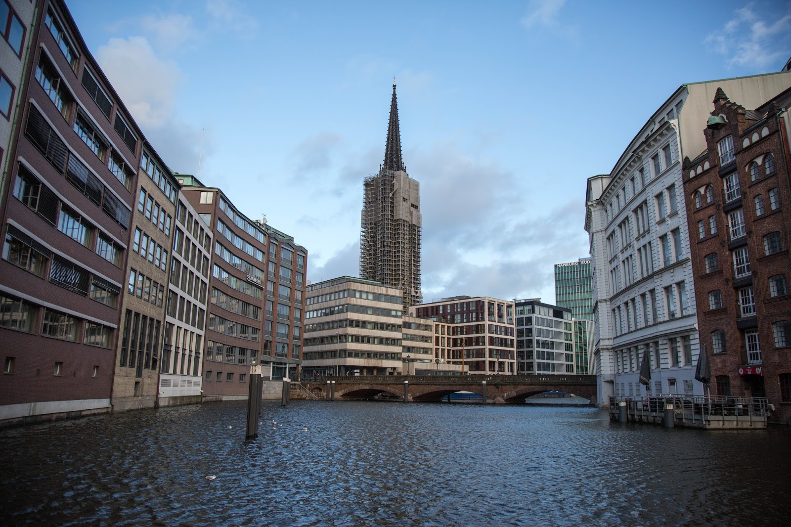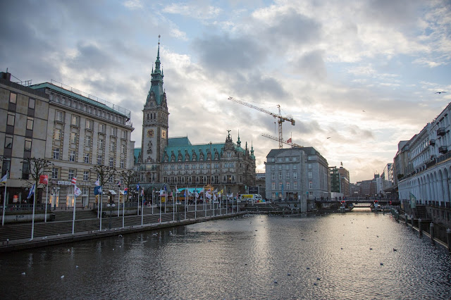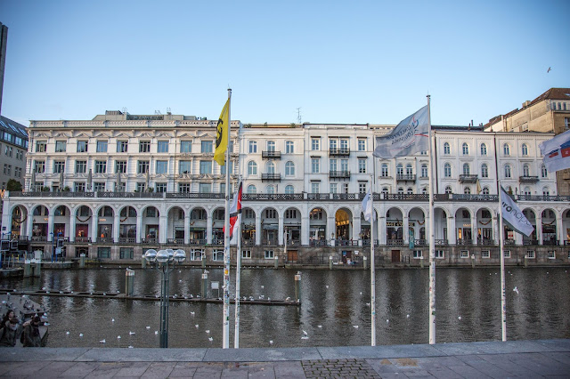 A 20 pasos de ditancia llegamos al canal del río Alster que desemboca en el inmenso lago Binnenalster. El lago es famoso pues los alrededores son espacios públicos utilizados para ferias y en verano para pasar el día disfrutando del sol. Cruzando la calle tenemos lo que estamos viendo, el Alsterarkaden. Una cuadra completa de negocios y cafés. Uno de ellos es el más antiguo de la ciudad. Directamente detrás se encuentra la calle con las tiendas más exclusivas de la ciudad, así que no se sorprendan de ver autos lujosos, choferes y guardaespaldas. Nosotros inclusive vimos gente tomandose fotos con fotógrafos profesionales. Creo que se trataba de alguna influencer o blogger de moda.