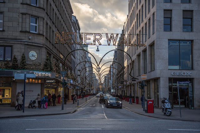 La calle detrás del Alsterarkade vemos decorada con adornos navideños, que para ser sincera, la mayoría de las calles se encontraban decoradas, pero esta lo estaba más ostentosamente. Nosotros, agradecidos.