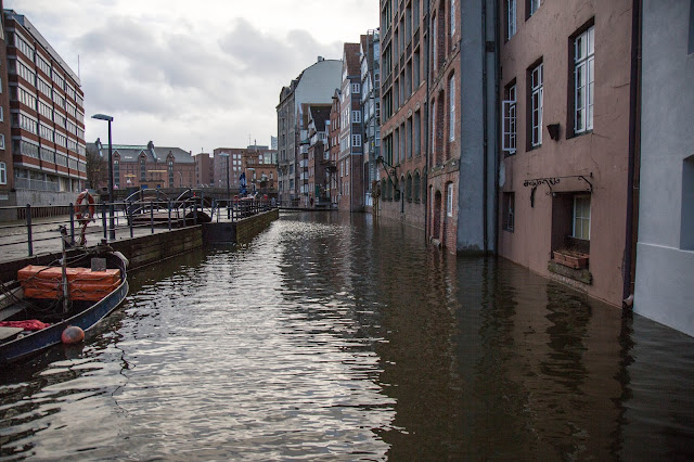 Rodeada por el río, si miramos las fotos de abajo, tenemos un pedacito de Cremon a la derecha y a la izquierda tenemos lo que es la calle más antigua de Hamburgo, la Deichstrasse.