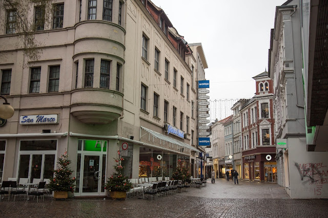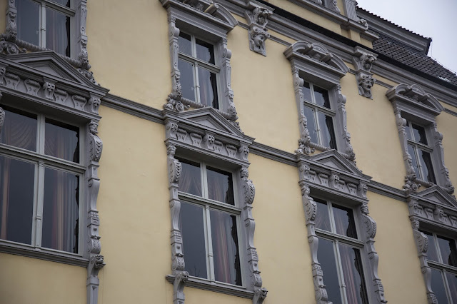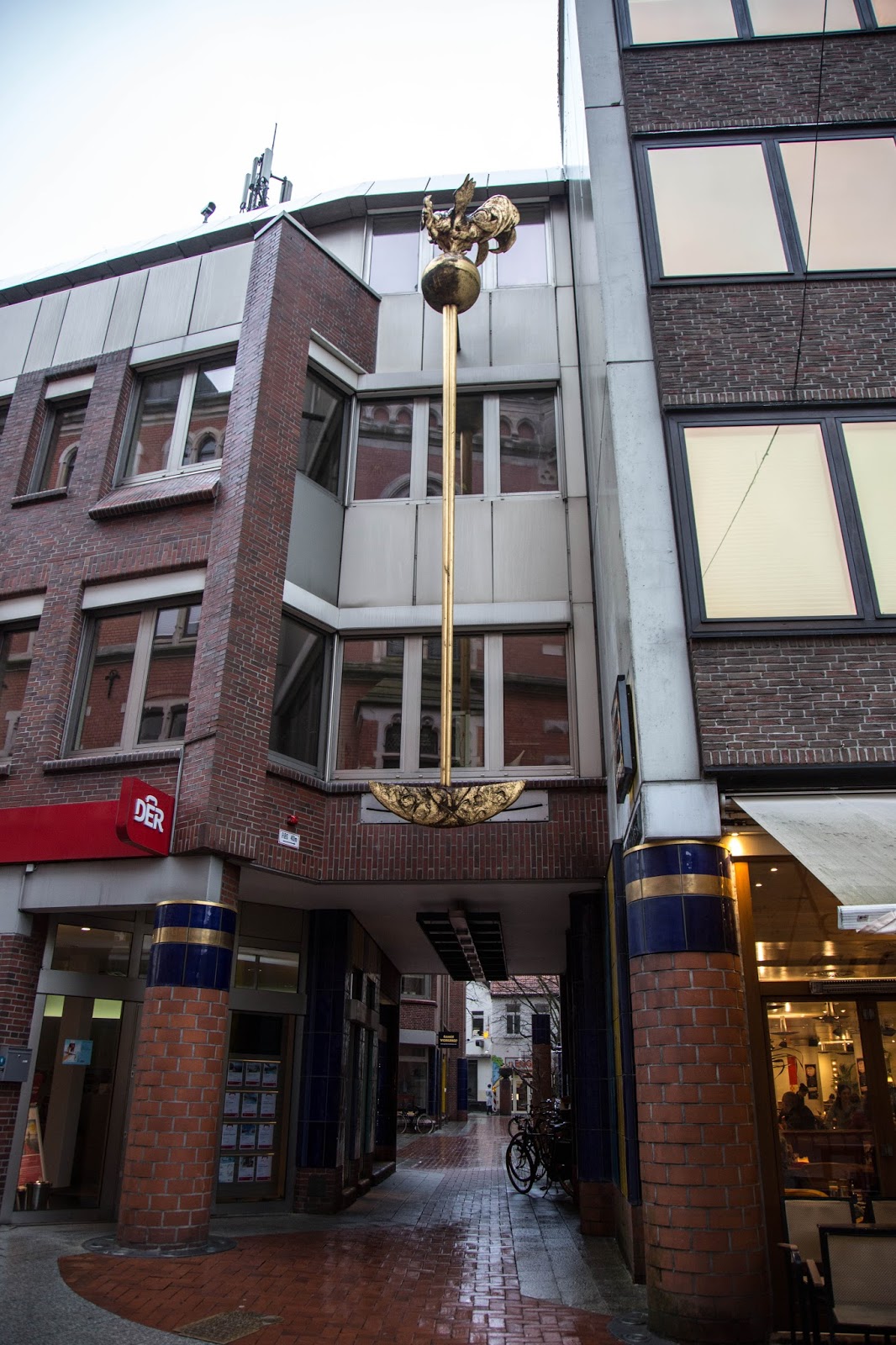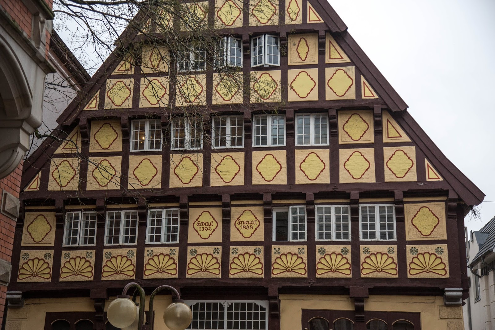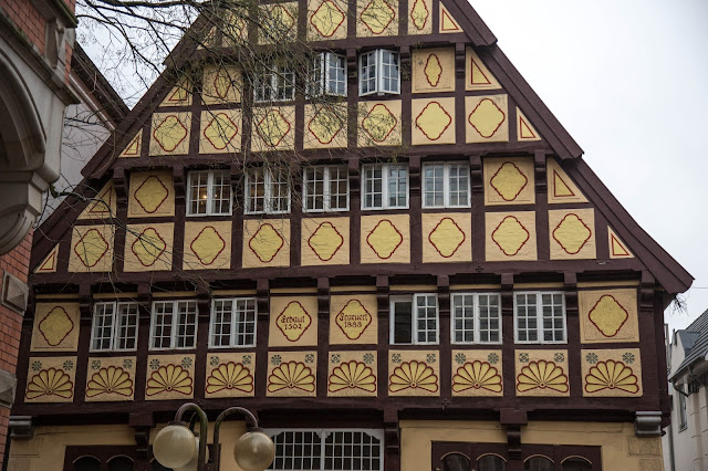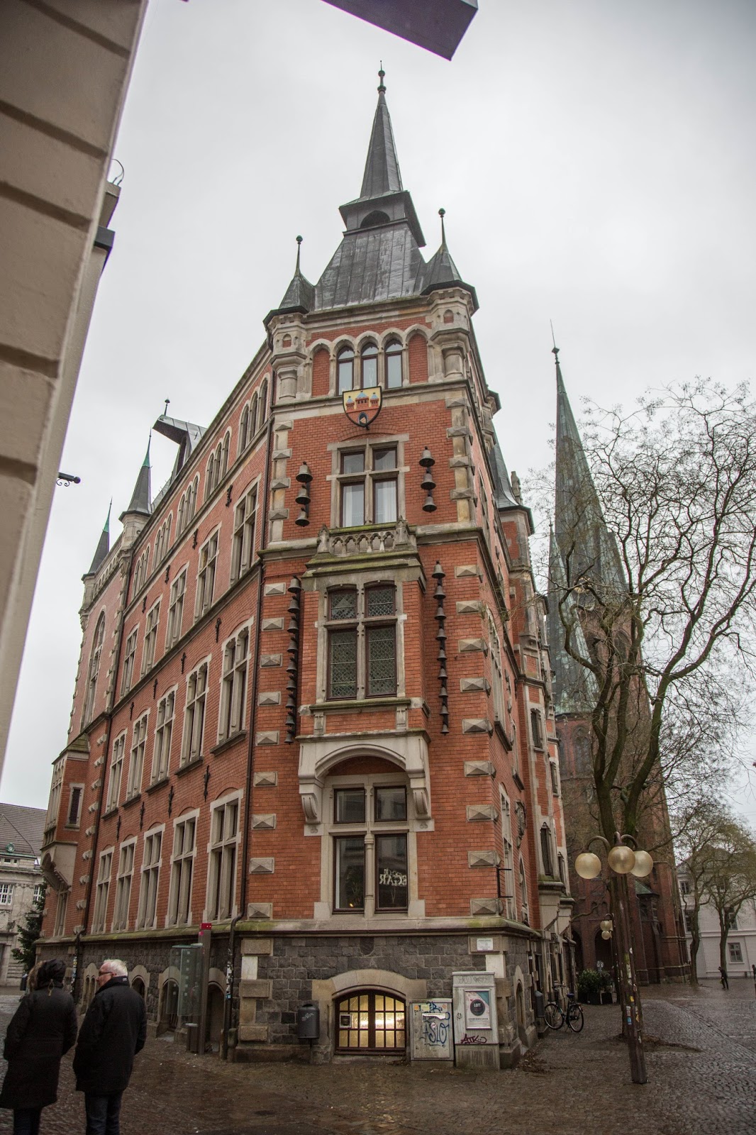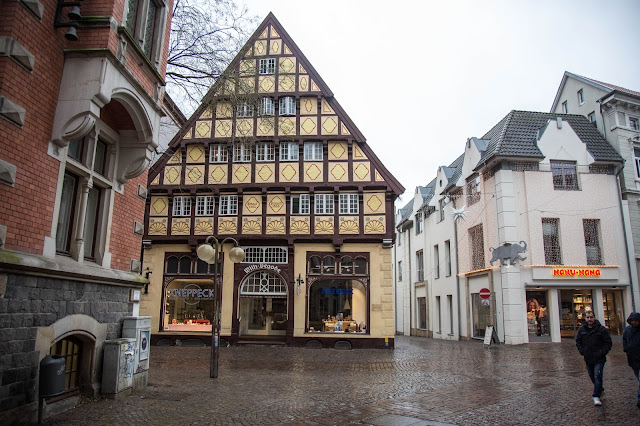 Así llegamos al Degodehaus, ese edificio amarillo que vemos al fondo. Data de 1502 y es uno de los sobrevivientes del incendio. Fue en 1616 que tomó la forma que vemos hoy y fue en este periodo que se encargaron pinturas y grabados para el adorno de su interior los cuales se conservan hasta ahora. Se considera de mucho valor histórico por ser el último edificio de época medieval en pie en Oldenburg. Su nombre se debe al dueño de 1860, Wilhem Degode. La propiedad sin embargo continua en manos privadas. Pero supongo que tienen restricciones por el valor histórico.