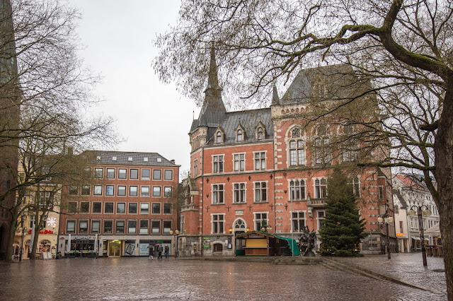 El de arriba corresponde al Rathaus, el ayuntamiento. En 1635 se había construido el primer Rathaus en este lugar pero en 1886 se echó abajo y cuando lo reconstruyeron adoptó elementos góticos y neorenascentistas que corresponden al edificio que vemos hoy. Tiene forma triangular y uno de sus lados da de frente a Degodehaus que veremos más adelante.