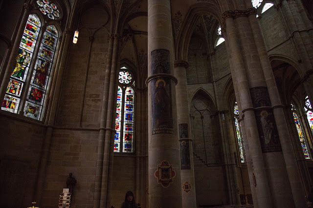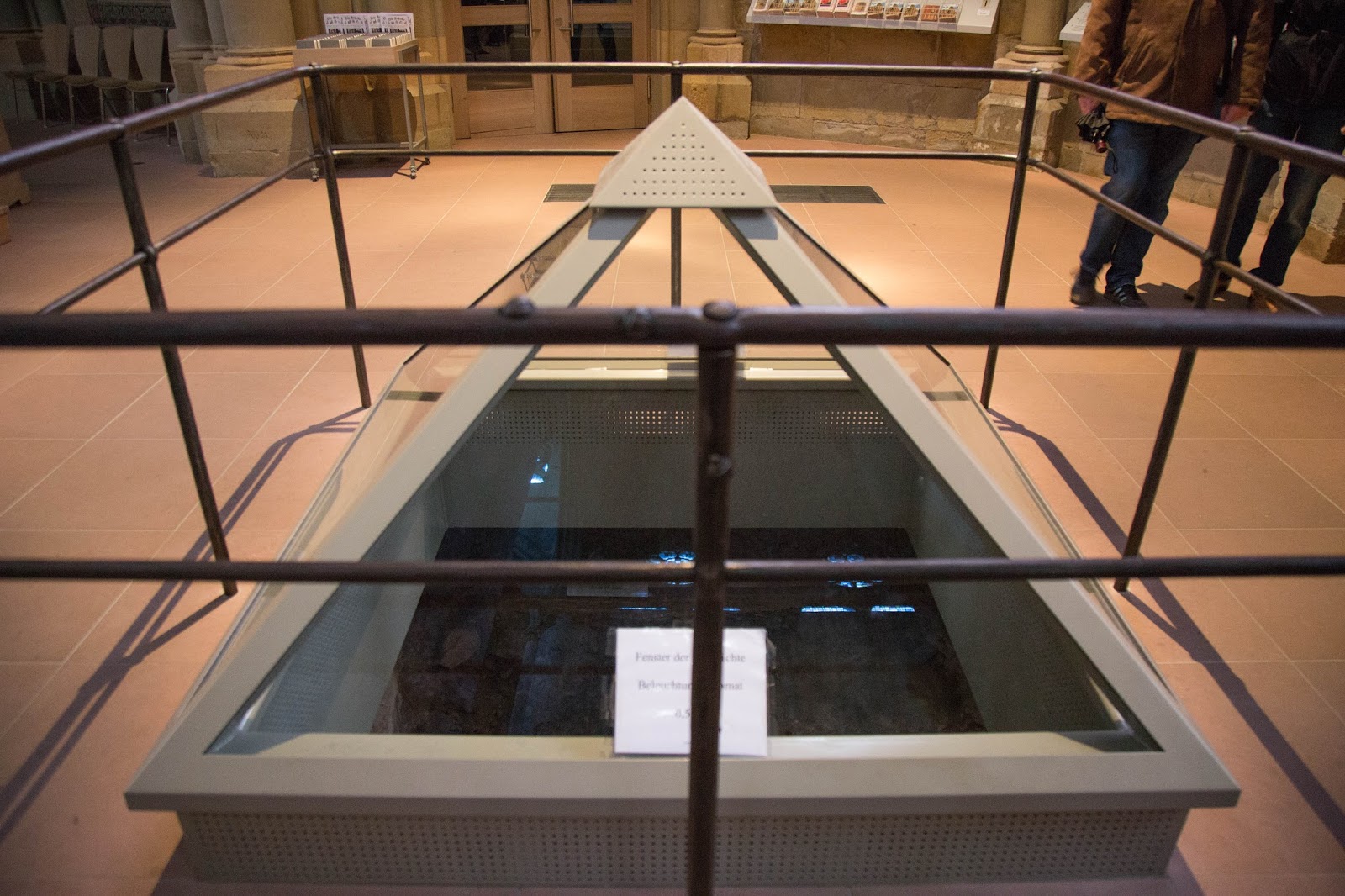 Entramos a la Iglesia de Nuestra Señora. Con vitrales coloridos y muchas esculturas tanto en las paredes como en el techo. Además, una cúpula de vidrio que nos muestra los vestigios encontrados en el suelo que corresponden a distintas antigüedades del edificio. Sin embargo, se deben abonar 50 centavos para prender la luz.
