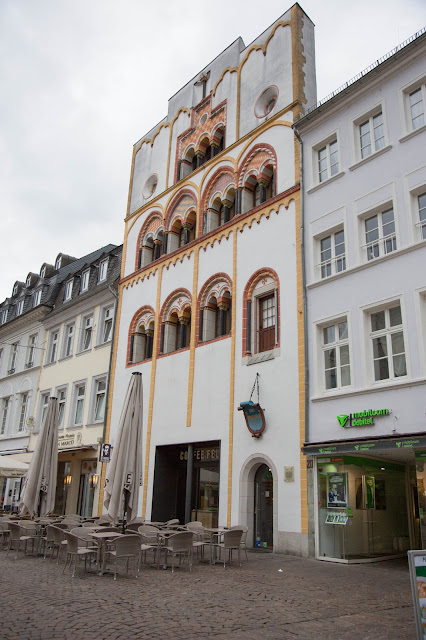 Recuerdan que mencionamos la casa roja detrás del Steipe? Pues es ésta, y actualmente guarda al museo del juguete. Fue diseñada por Wolfgang Struppeler y era la vivienda del secretario de la catedral, Johann Polch. La figura que vemos en medio corresponde a San Antonio, el patrón de la casa roja. Y la inscripción en letras amarillas está en latín y dice que Trier es 1300 años más antigua que Roma, lo cual es parte de una leyenda según dicen.