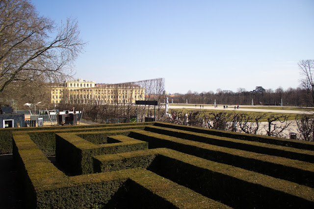 Volviendo al tema del palacio, lo que vemos al fondo de la foto de abajo es la Glorieta, la edificación sobre la colina se vuelve más impactante a medida que nos acercamos. A mitad de los casi 1000 metros que hay entre el palacio y la glorieta, paramos en el laberinto verde.