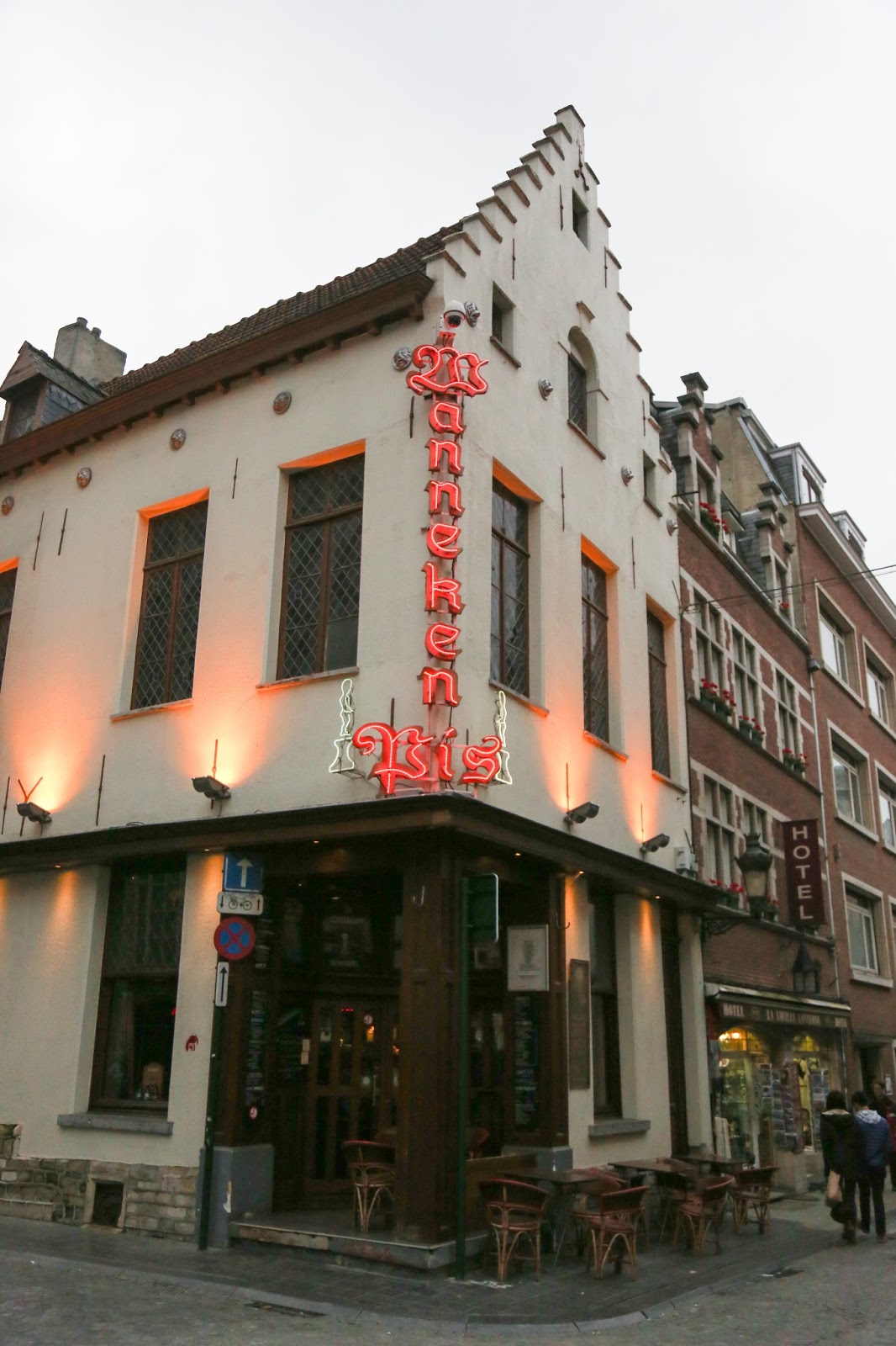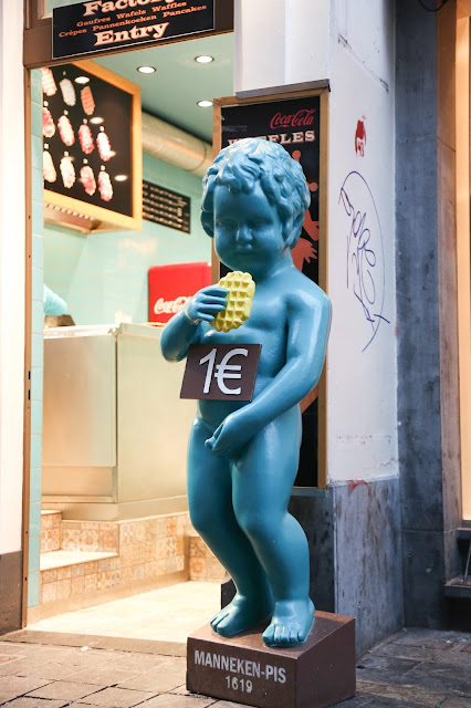 Cuando más nos acercamos a la zona del Menneken Pis, que podría considerarse el punto más turístico del centro, más aparecen tiendas de chocolates, waffles belgas y cervezas. El Menneken Pis empieza a aparecer en todas las vidrieras y nos avisa que estamos cerca.