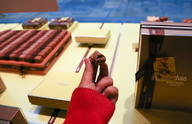 Aquí termina el recorrido por las chocolaterías de la galería. Caminamos a otra zona y podemos notar que nos encontramos en un espacio menos turístico. En el camino pasamos por una menos tradicional Neuhaus. No decimos que sea fea, simplemente que podemos notar la diferencia de estilo entre la tienda original y una tienda normal.