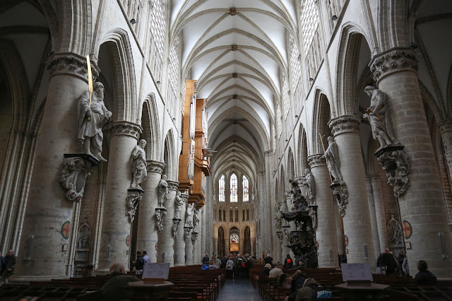 La iglesia es inmensa y encontramos obras como La Crucifixión de Michel van Coxie. No solo pinturas, también esculturas, vitrales y mucho más.