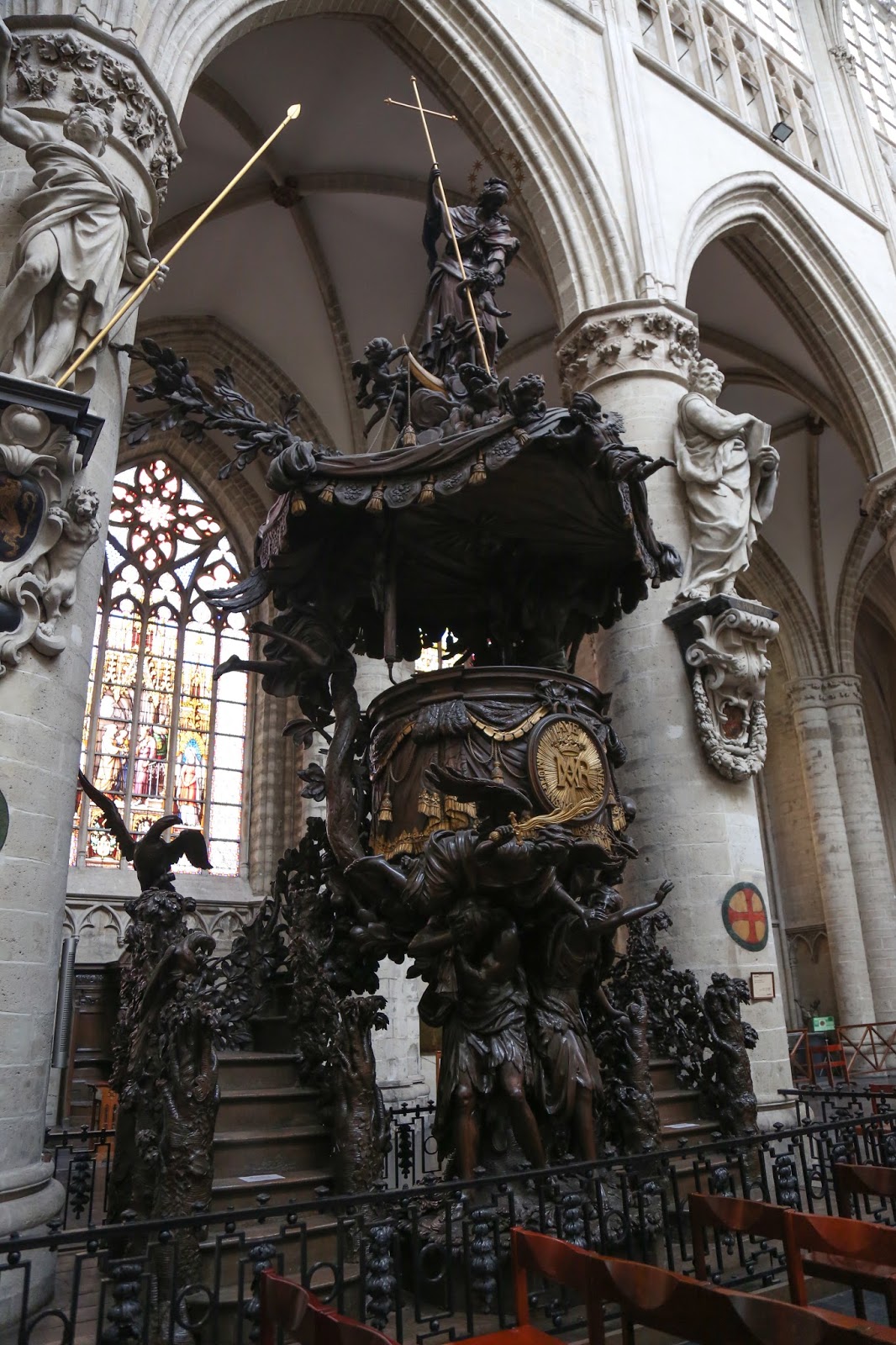 En la foto de arriba, a la derecha, esta la atracción central. Como saben, no acostumbramos a tomar fotografías dentro de las iglesias pero esta obra merece todas las fotografías. Este púlpito de estilo barroco es obra de Hendrik Frans Verbruggen. Construido en 1699 representa parte del jardín del Eden al momento de la expulsion de Adan y Eva, y encima del púlpito, la redención por medio de la Virgen Maria.