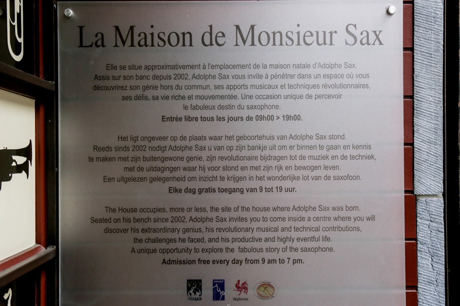 Un museo gratuito donde podemos recorrer el lugar donde en 1814 nació el inventor del saxo. Afuera, el propio Adolphe nos espera sentado en el banco. Sax, su apellido, y «phono» que significa sonido. El Sonido de Sax es uno de los instrumentos musicales más importantes y esto se debe a su importancia en el Jazz. Falleció en 1894, en Paris y fue enterrado en el cementerio de Montmartre. Pobre y antes de poder ver el auge del jazz en 1920.
