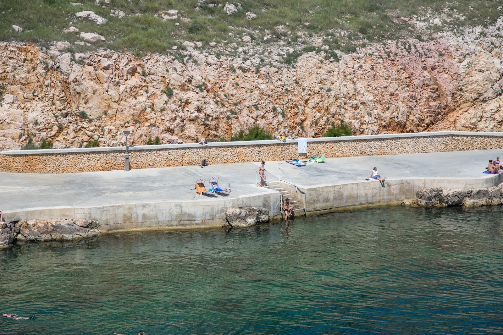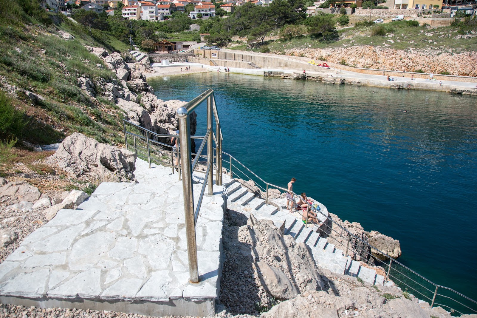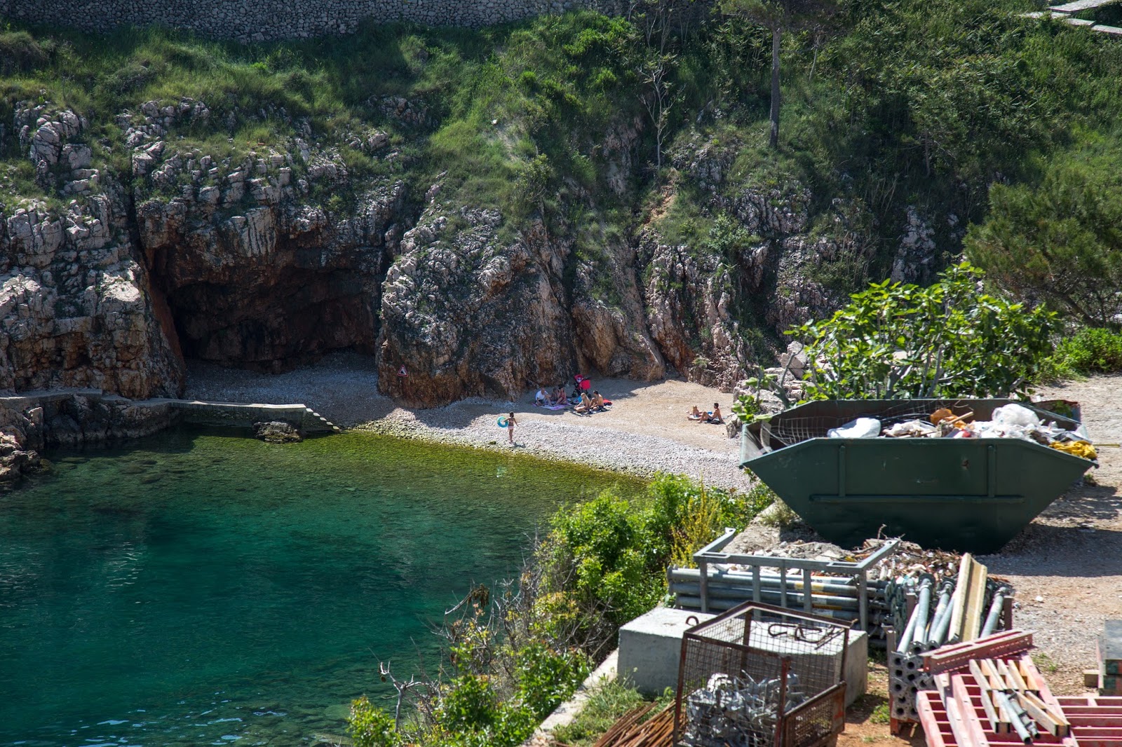 Y encontramos la playa. Allá abajo, a la derecha. Así es. Esa es la playa a la que va toda la gente de este lugar. También se puede acceder por el otro lado. El que vemos directamente enfrente. Allí iremos en un rato. Igual pueden observar las plataformas y escaleras que fueron construidas para aprovechar mejor este lugar. También vemos personas practicando buceo. A pesar de que parece pequeña, la playa es ampliamente aprovechada.