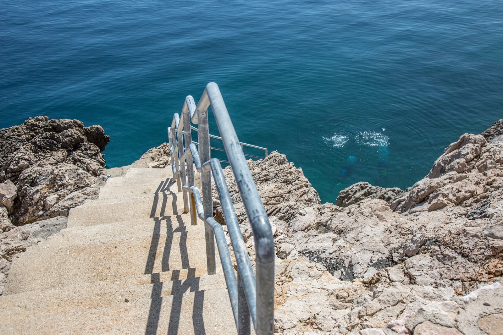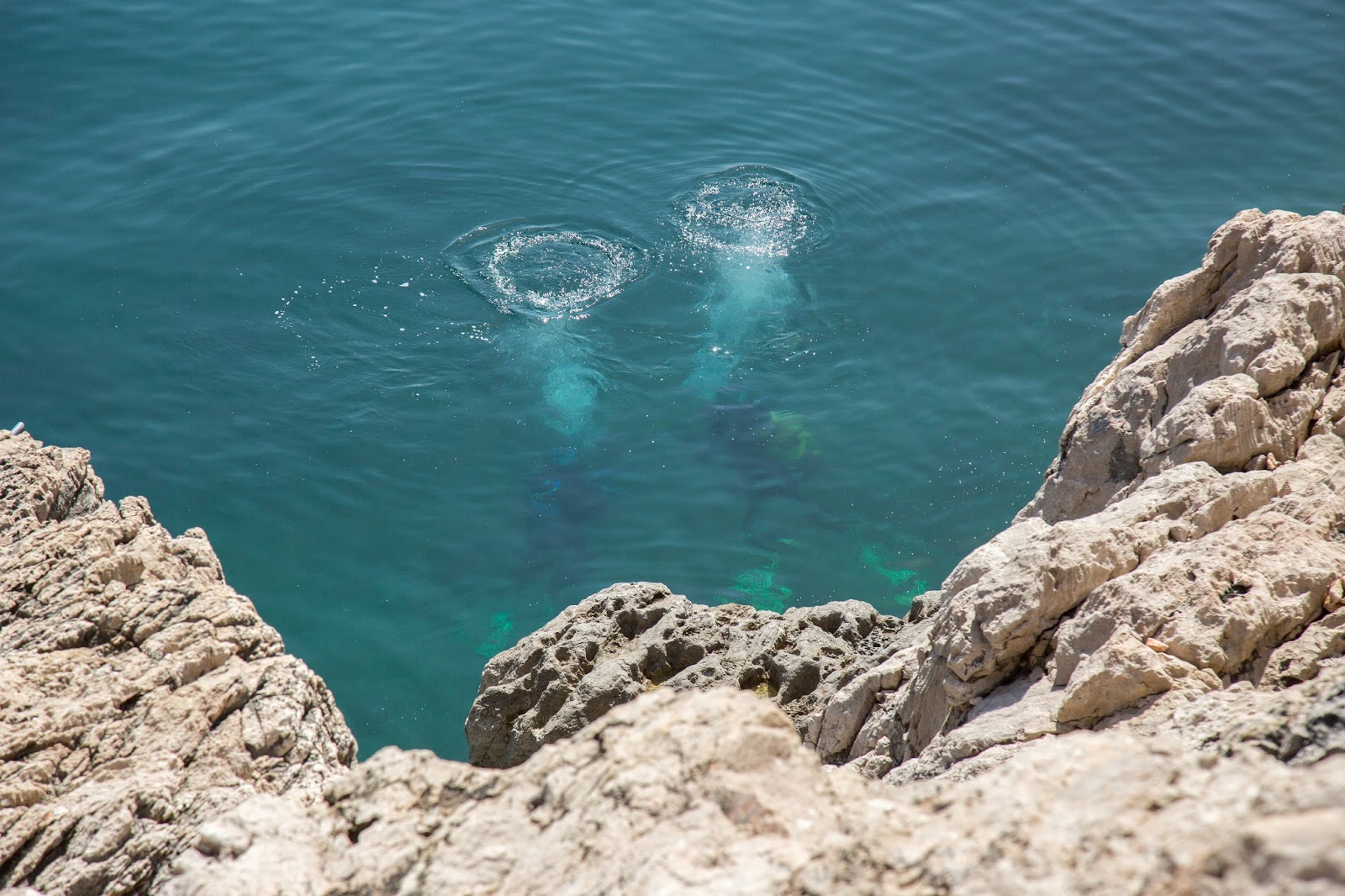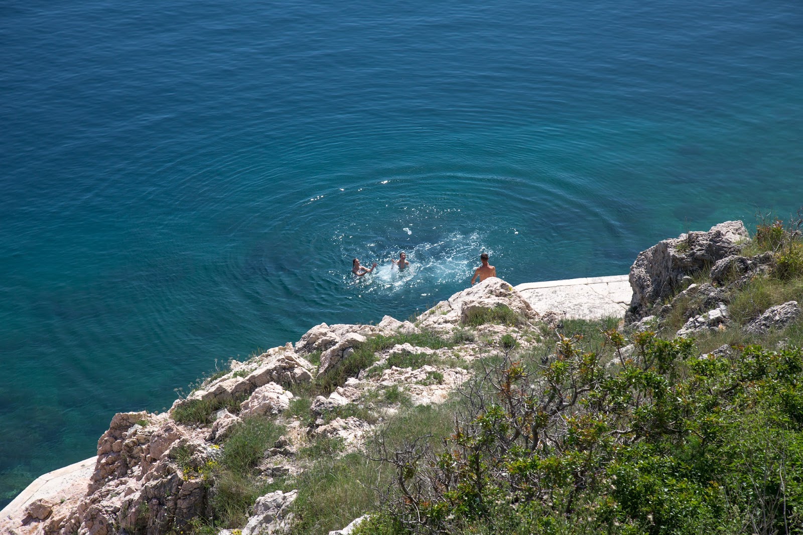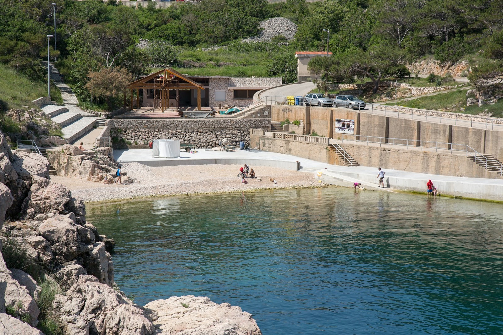 Y encontramos la playa. Allá abajo, a la derecha. Así es. Esa es la playa a la que va toda la gente de este lugar. También se puede acceder por el otro lado. El que vemos directamente enfrente. Allí iremos en un rato. Igual pueden observar las plataformas y escaleras que fueron construidas para aprovechar mejor este lugar. También vemos personas practicando buceo. A pesar de que parece pequeña, la playa es ampliamente aprovechada.