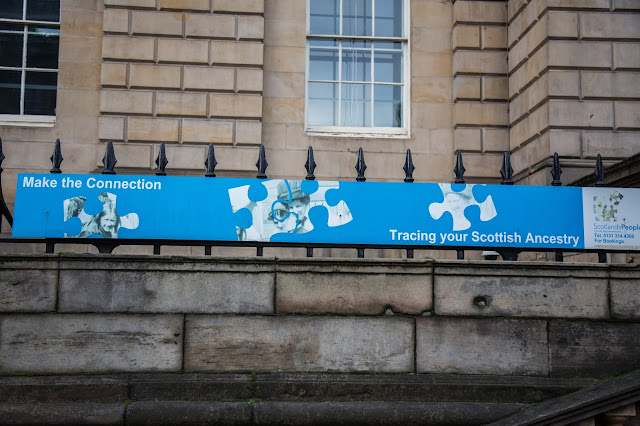 Como les voy a contar muy superficialmente, Escocia es muy famosa por sus clanes. Los clanes son las familias y la organización social del país. Los clanes se identifican con varios elementos de los cuales el más famoso es el tartan. El tartan es ese «estampado» que se ven en los «kilts» que son las «polleras» escocesas. Cada clan tiene un diseño diferente que le identifica. Estos es parte del esquema de orgullo e identidad que baña el país. Por supuesto que con los clanes se escuchan muchísimas historias de odio, venganza y enemistades que se llevan por años y años. De todas formas, todo esto aporta al tesoro cultural del país. Existen oficinas donde uno puede rastrear a sus ancestros como el que vemos frente al hotel Balmoral, la oficina Nacional de Registros .