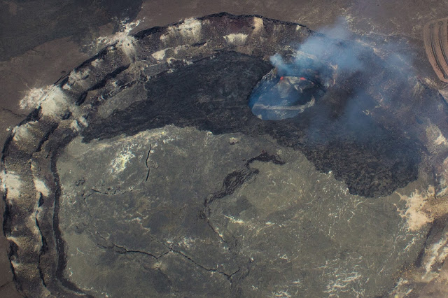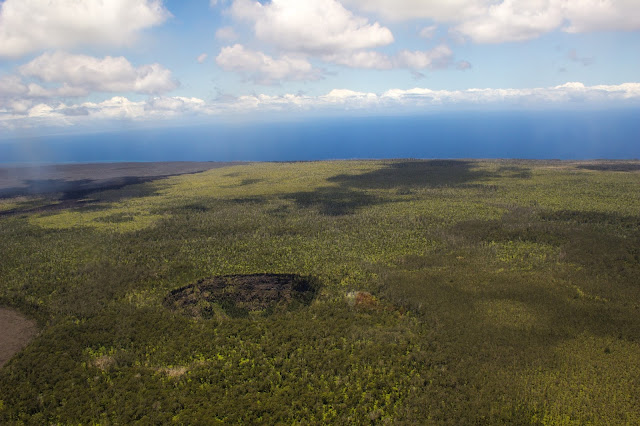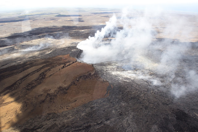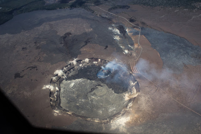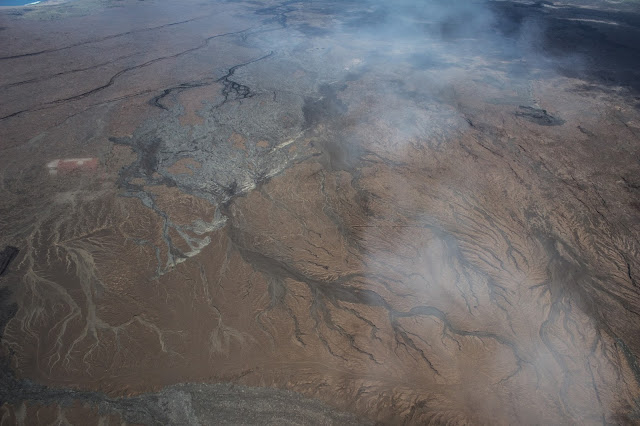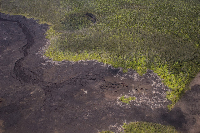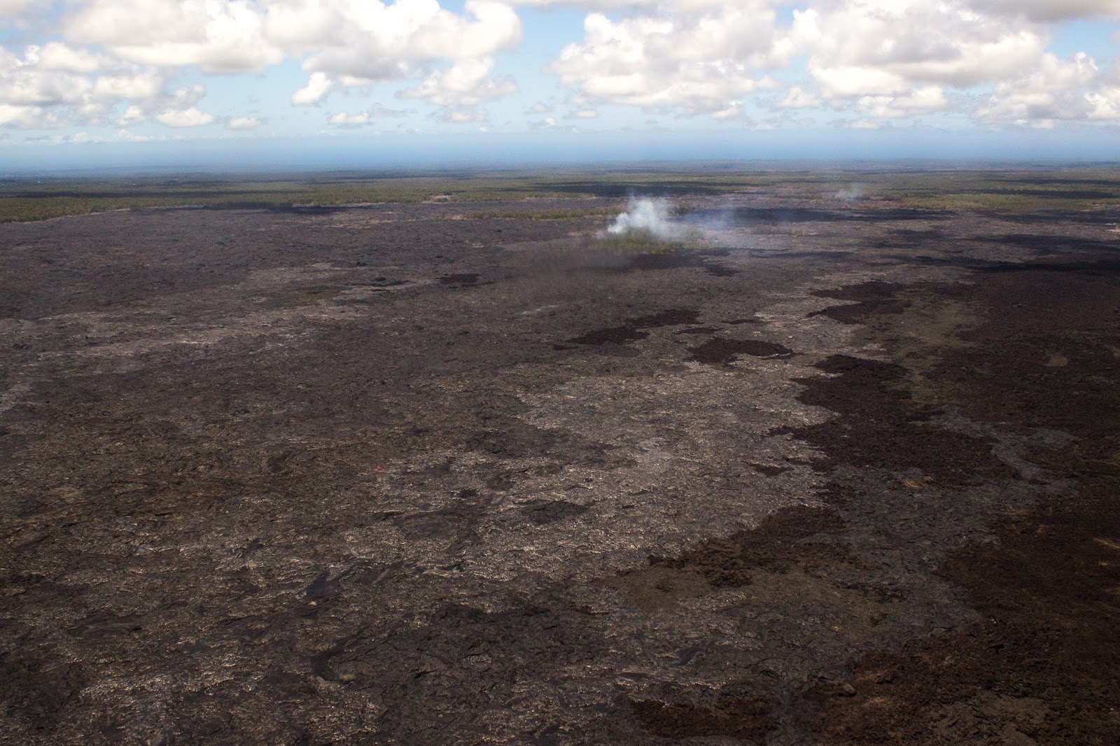 Eso naranja que se veía dentro del «redondo» es lava. Lava pura. Ahora vamos a otras de las bocas. Tengan en cuenta que las fotos que se ven online de lava cayendo directamente al océano ya no sucede hace tiempo. No es algo constante y pueden ver desde esta tomas areas que la distancia es importante por lo que la explosion debe ser intensa y constante. También, hay que saber que Hawai’i es el lugar con la tierra más nueva del mundo. Esto se debe a que la constante erupción hace que se «cree» nueva tierra. Hay veces canales subterráneos de gases hacen que fragmentos salgan volando (pueden encontrar videos) por lo que es bastante peligroso.