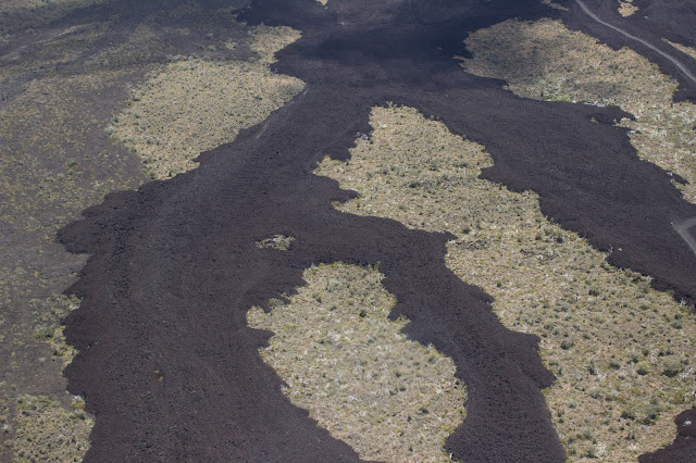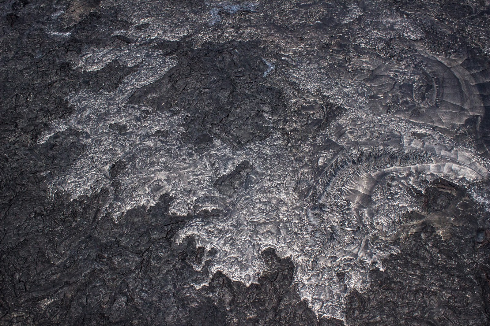 Las «manchas» negras son huellas de lava. La coloración es acorde a su antigüedad. Los pequeños cráteres o protuberancias se debe a que la lava también va por bajo la tierra y también hay gases que producen esta deformidades.