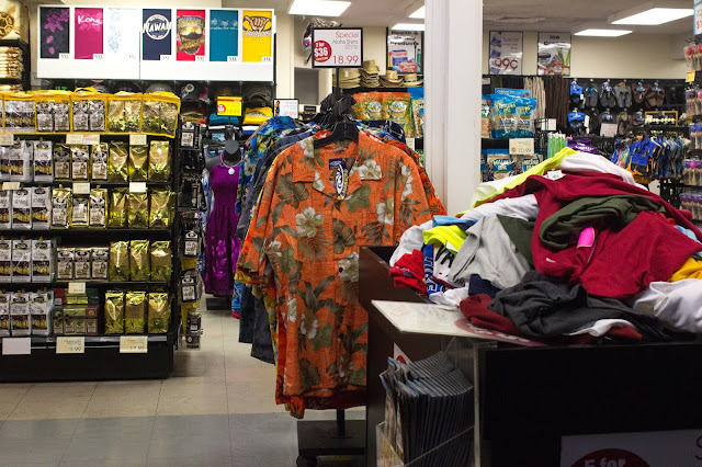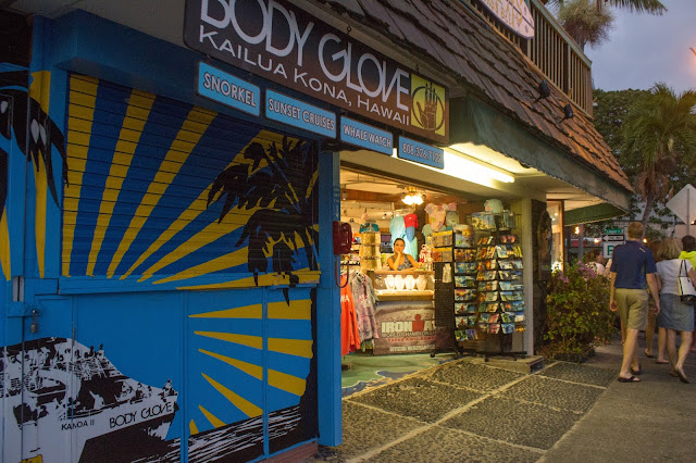 Más tarde, cuando oscurece recorremos la zona comercial… camisas hawaianas y cafe de Kona podemos encontrar en casi todas las tiendas.