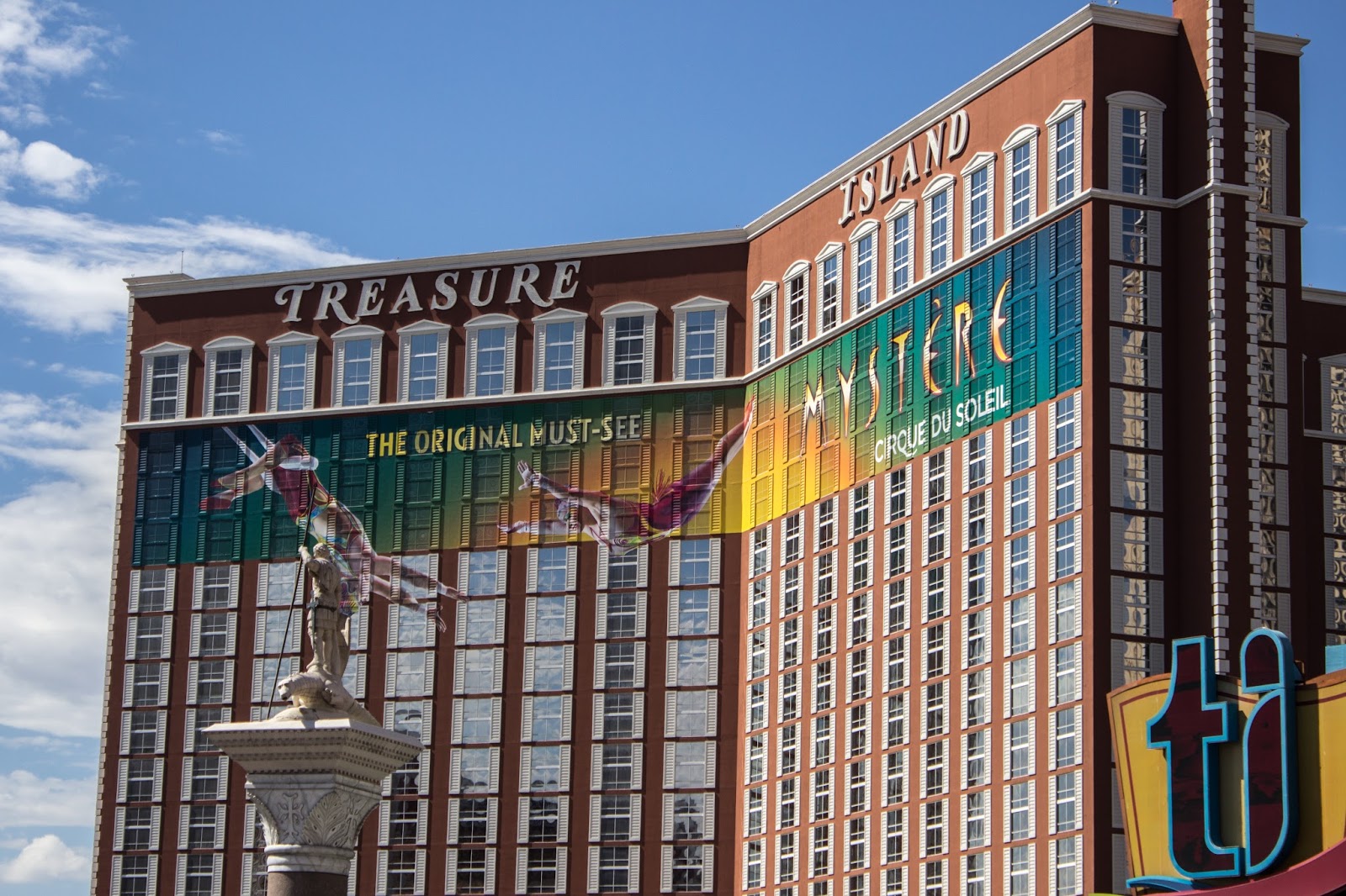 Aquí encontramos el primero de los puentes aéreos que nos permite pasar de un lado del Strip a otro. Pero atención, que las distancias son largas y los cruces no están tan cerca uno de otro. Del otro lado vemos un complejo comercial y a lado el hotel Treasure Island.