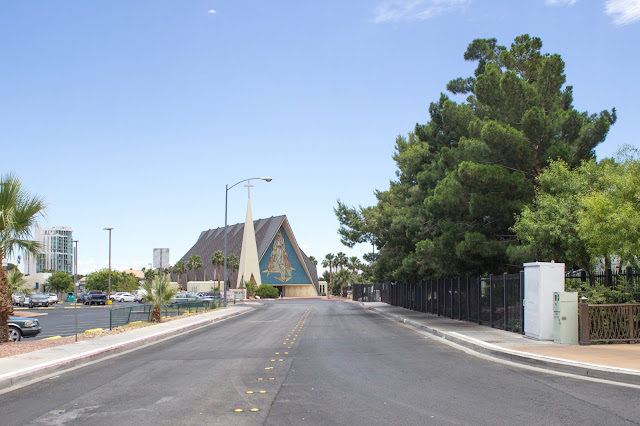 Antes de llegar al Encore, a pesar de que lo vemos desde lejos, en la cuadra antes de llegar al hotel vemos esta iglesia. Es la Iglesia del Angel Guardian y es la iglesia católica más cercana al Strip de la ciudad. Desde 1963 celebran misas y es visitada no solo por los habitantes de Las Vegas sino también por turistas.