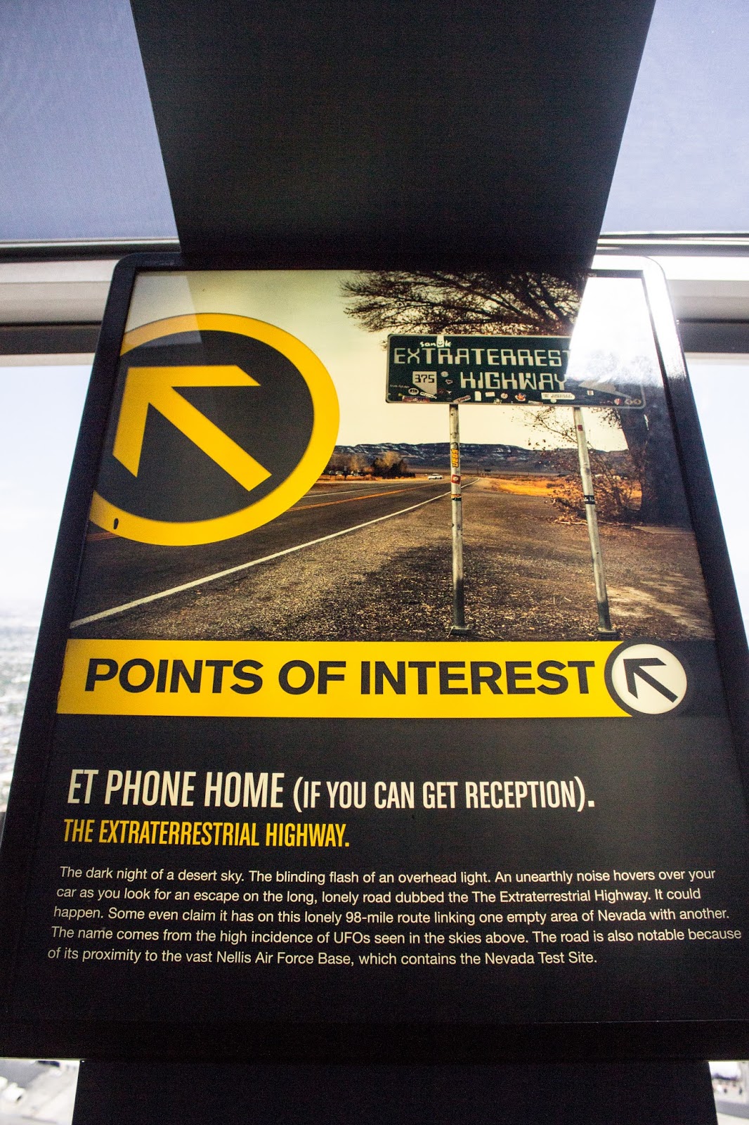 Mientras esperamos al ascensor notamos el punto de «aterrizaje» de los que se animan a lanzarse desde la cima. También posters que nos cuentan sobre la Ruta de los Extraterrestres.