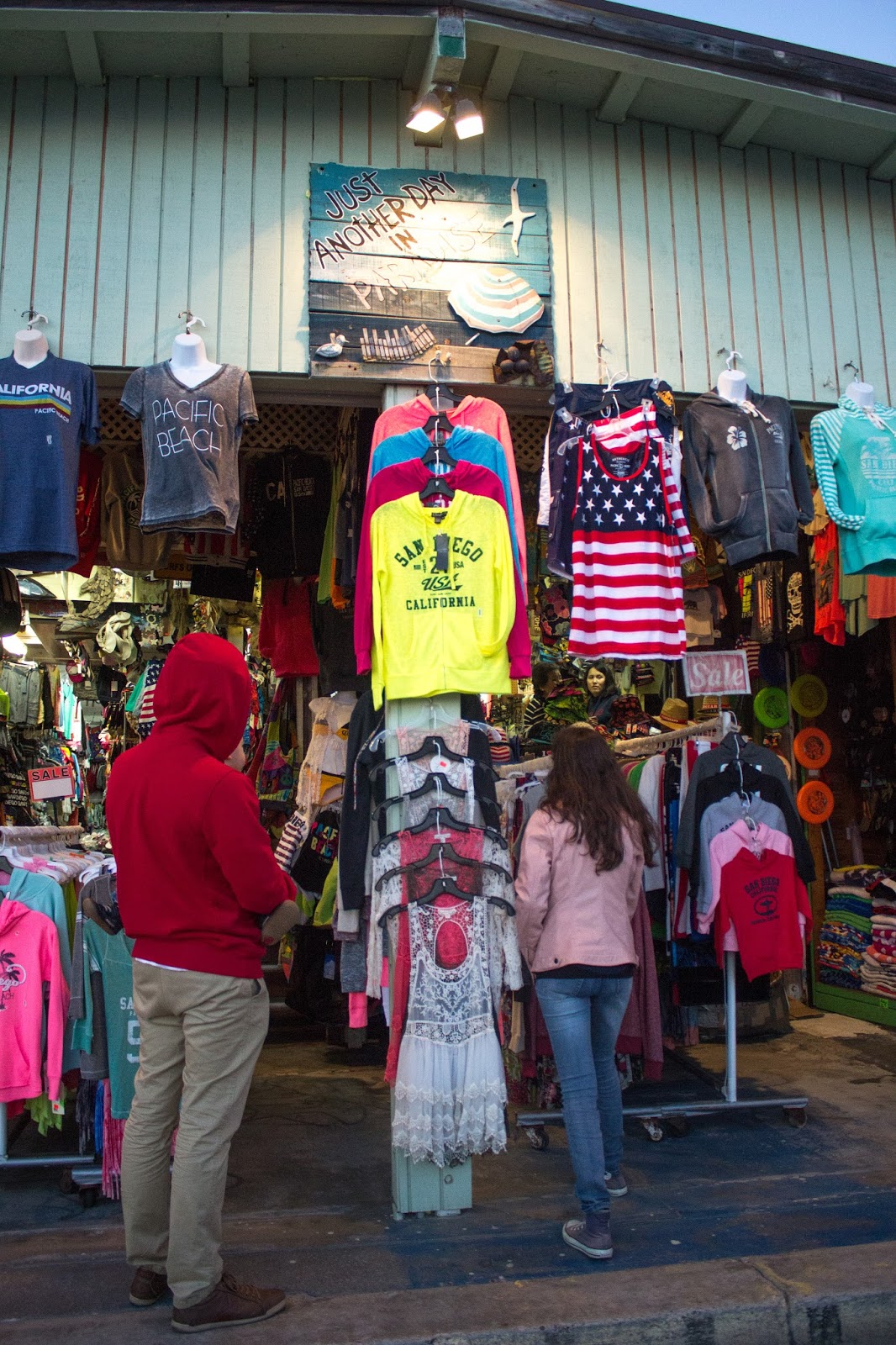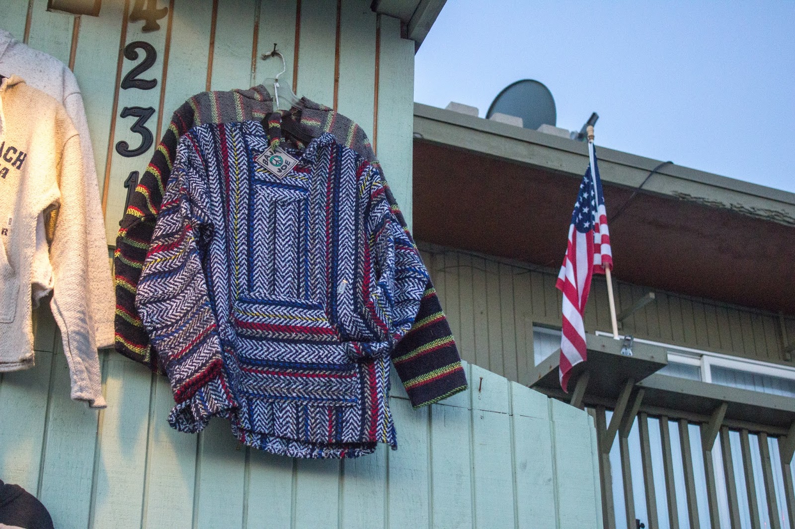 Aquí varias tiendas nos ofrecen el tradicional «abrigo californiano». Este abrigo es conocido como Baja Hoodie debido a que se popularizó en Baja California. También lleva el menos afortunado nombre de Drug Rug. Consiste en un abrigo con bolsillo tipo canguro, capucha y esta hecho en material de poncho mexicano a pesar que actualmente ya se hacen de cualquier material. Fueron especialmente populares en los años 70 asociados a surfistas californianos que iban a Baja California en Mexico y al volver traían esta prenda la cual era especial para el fresco nocturno de la playa. La verdad que actualmente ya pocos saben su origen o su asociación a la cultura hippie y son parte de los muchos souvenirs de California o Baja California.
