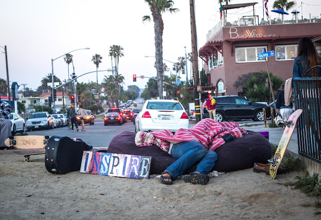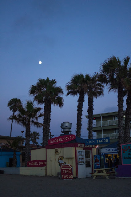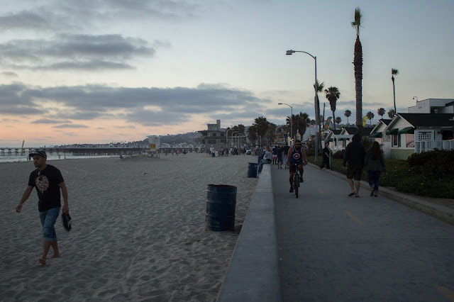 Nos dirigimos a una parte distinta de San Diego. Vamos hacia una de las zonas de playa. Recorremos un poco el barrio y vamos a la playa para ver por primera vez en mi vida, un atardecer con el sol cayendo directamente al mar. Pero primero vamos a la bahía.