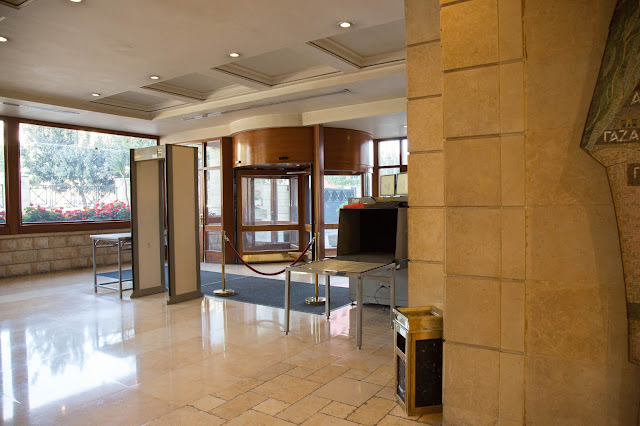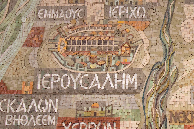 Pero como estamos en el hotel y encontramos un mapa, queremos que lo observen y luego en los próximos posts les contaremos mas sobre porqué un mapa esta hecho en mosaico y porqué Jerusalen tiene esa forma.