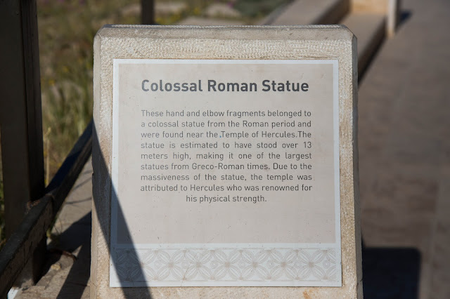 La mano que vemos abajo es una de las piezas más famosas de este lugar. Es la mano de Hercules y se cree que la estatua completa habría tenido cerca de 13 metros de alto. Estaba hecha en mármol por lo que las partes ausentes se cree se robaron para ser reutilizadas. También se habla del Templo de Hercules que son las columnas que veremos más adelante.