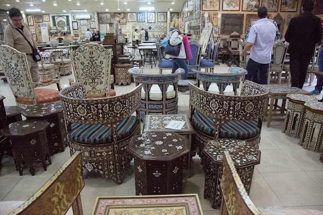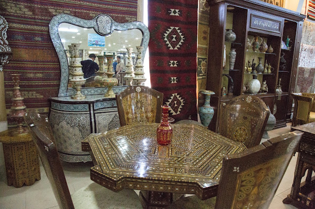 También vemos varios muebles con trabajo en nácar. Según la persona que atendía, estas son artesanías tradicionales de Siria. Debido a los conflictos muchos artesanos migraron y se establecieron en Jordania para continuar con sus trabajos por lo que hoy se puede ver mucho de estos muebles en varias tiendas de artesanías y souvenirs.