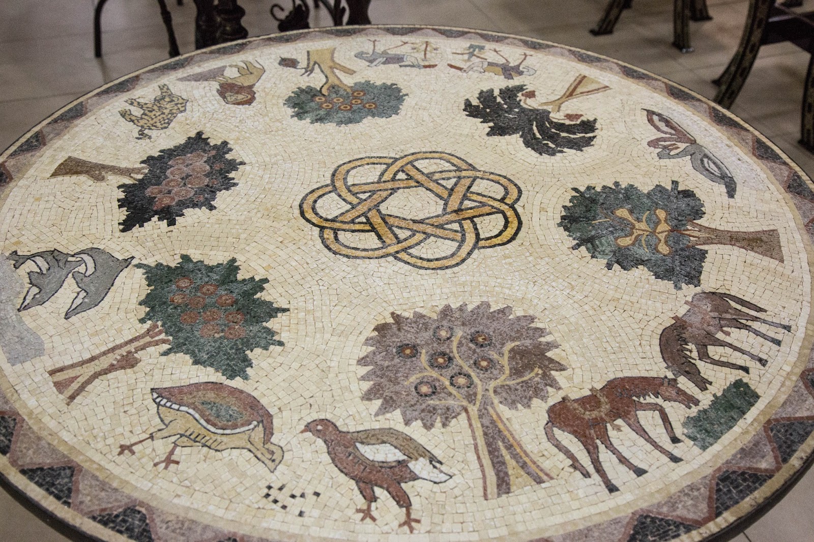 Los diseños más reproducidos son el del mapa de Madaba y el árbol de la vida. Existen dos técnicas, una de ellas es la que vemos aquí y la otra es una menos minuciosa. En esta las pequeñas piedras de colores son cortadas y luego armadas sobre una guía de diseño. Cuanto mas pequeñas las piezas más dificultoso el trabajo pero a menudo más bello el resultado.