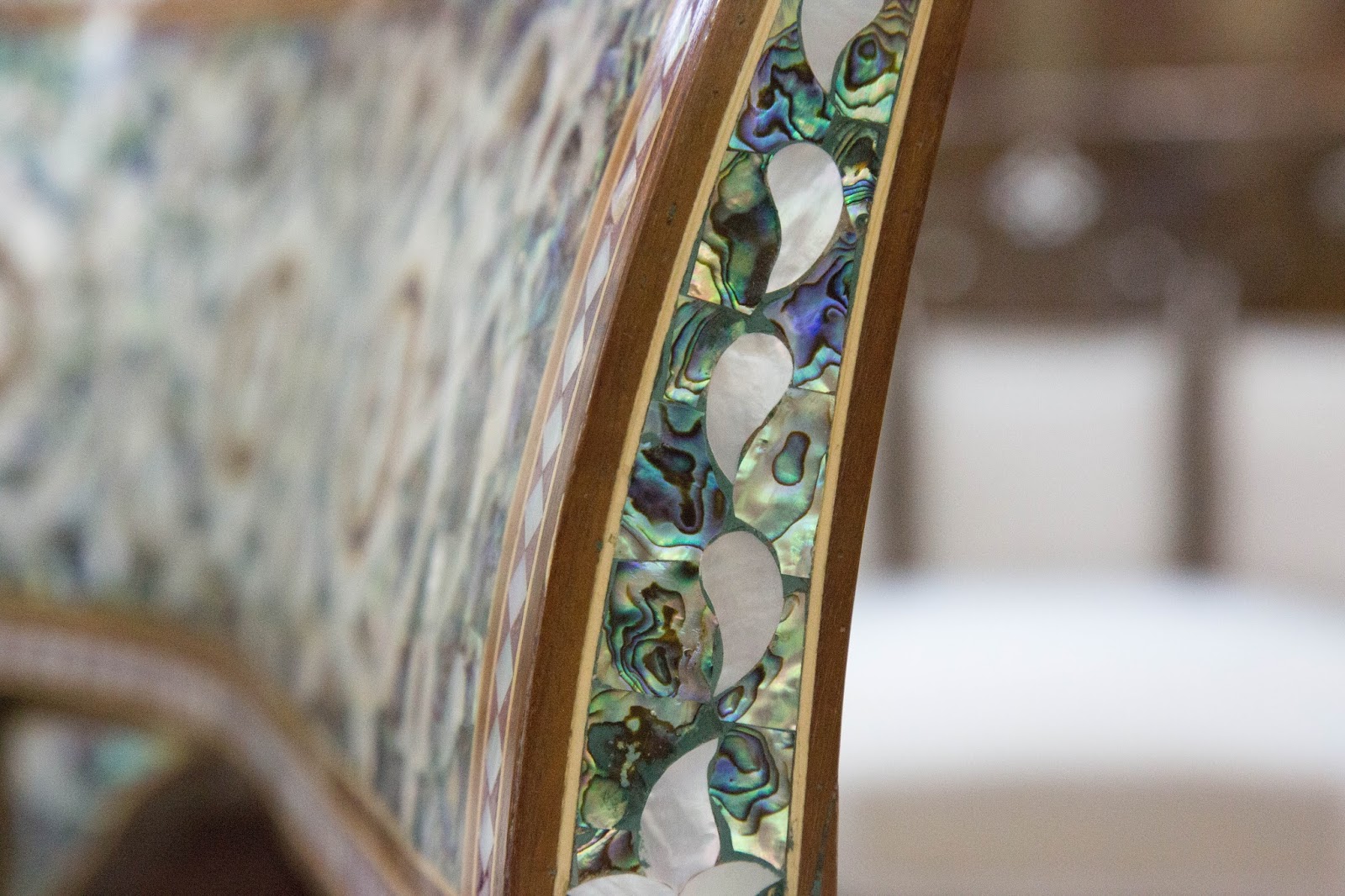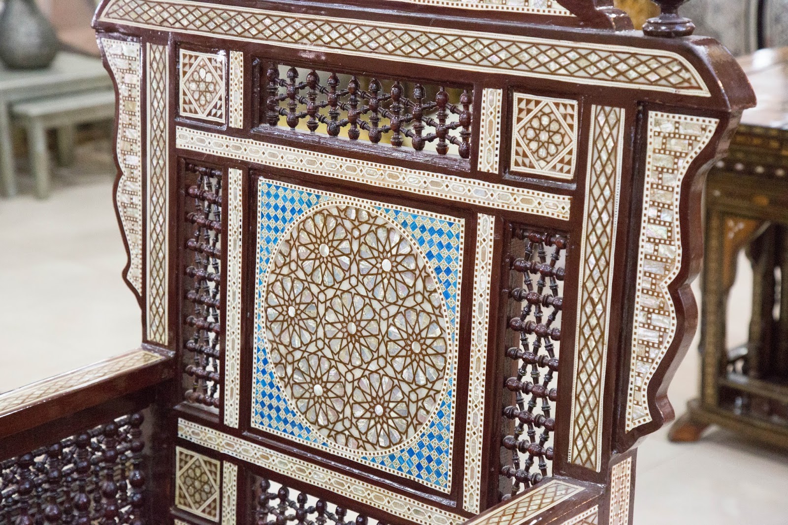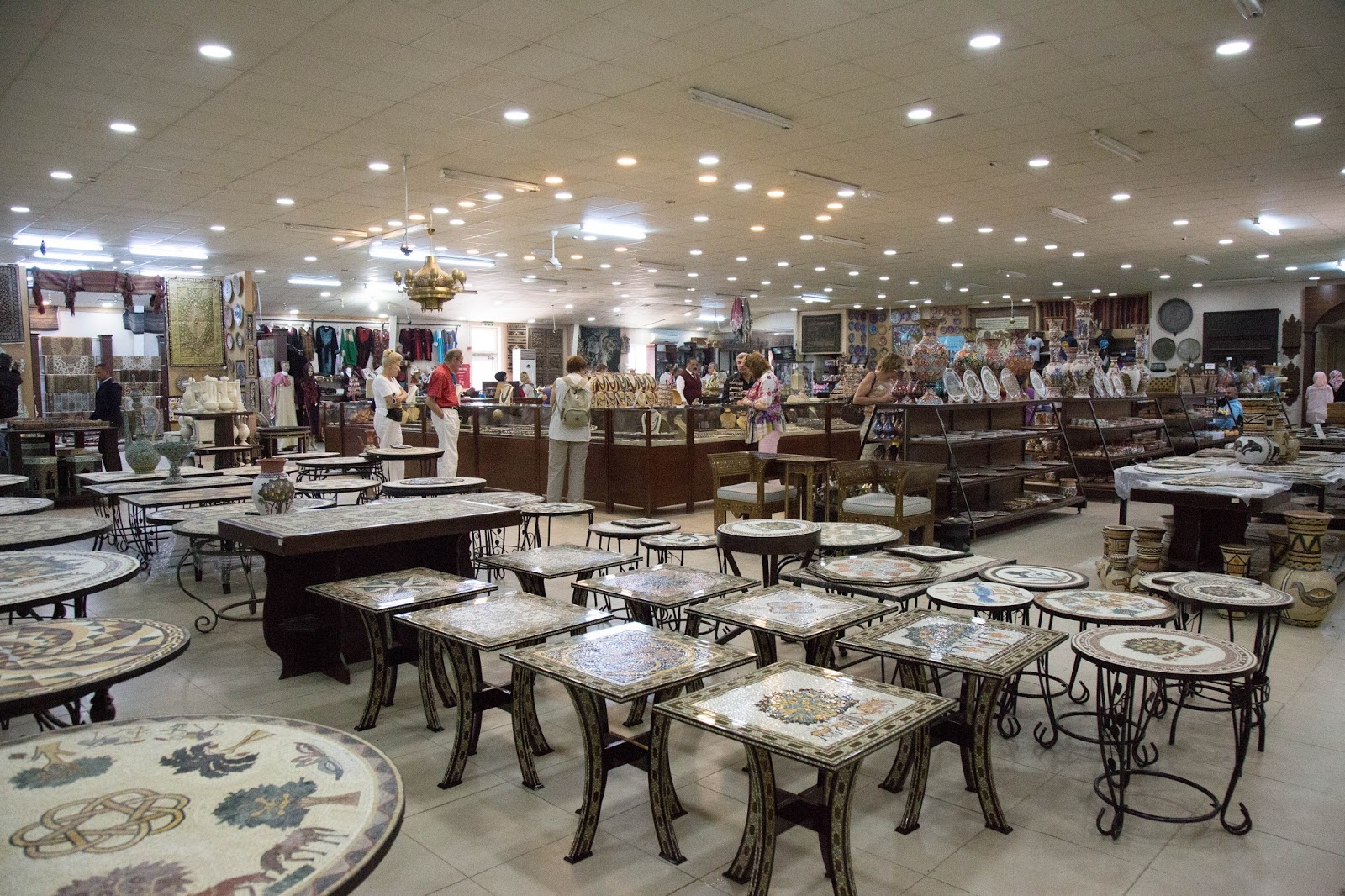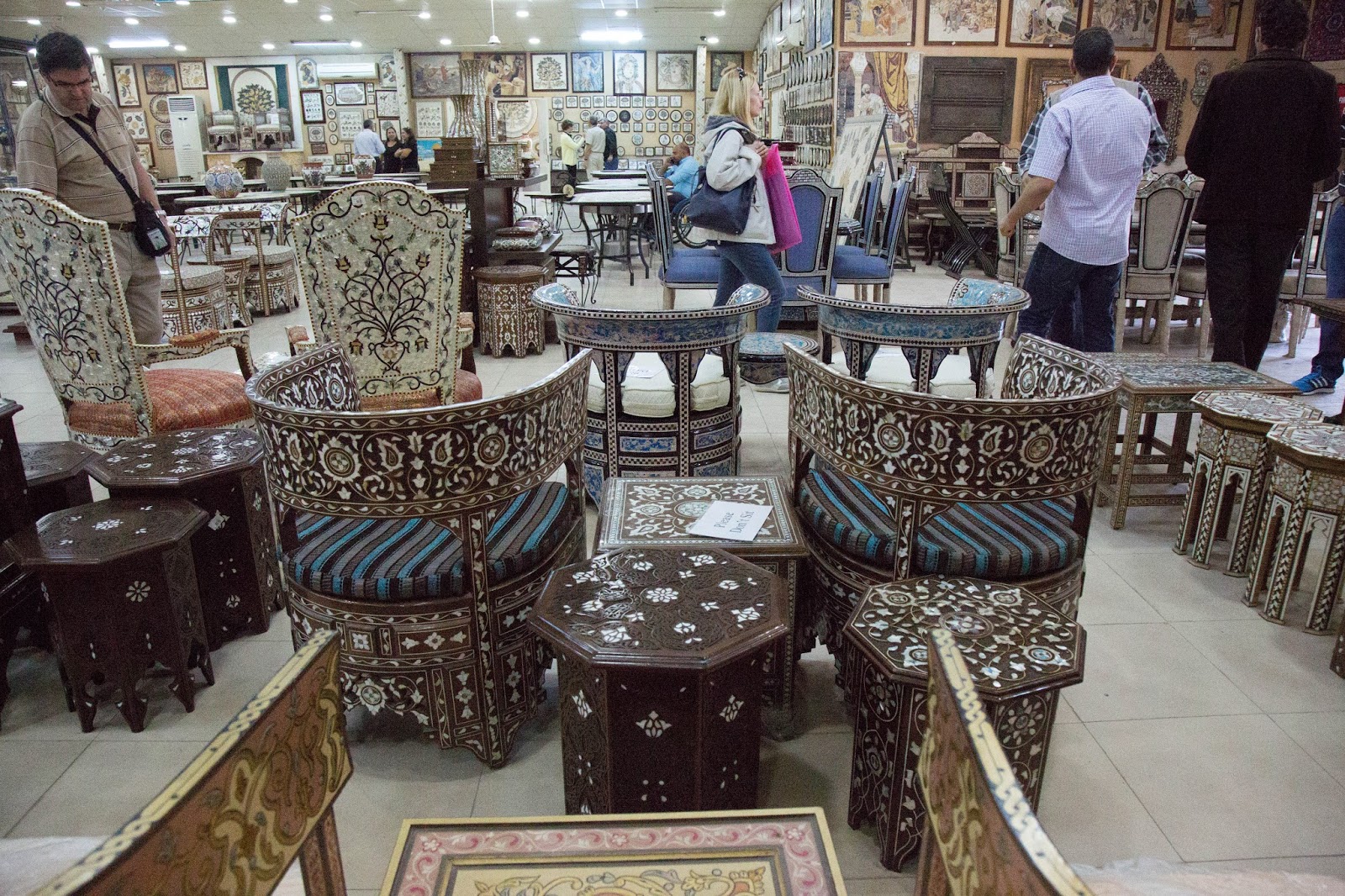 También vemos varios muebles con trabajo en nácar. Según la persona que atendía, estas son artesanías tradicionales de Siria. Debido a los conflictos muchos artesanos migraron y se establecieron en Jordania para continuar con sus trabajos por lo que hoy se puede ver mucho de estos muebles en varias tiendas de artesanías y souvenirs.
