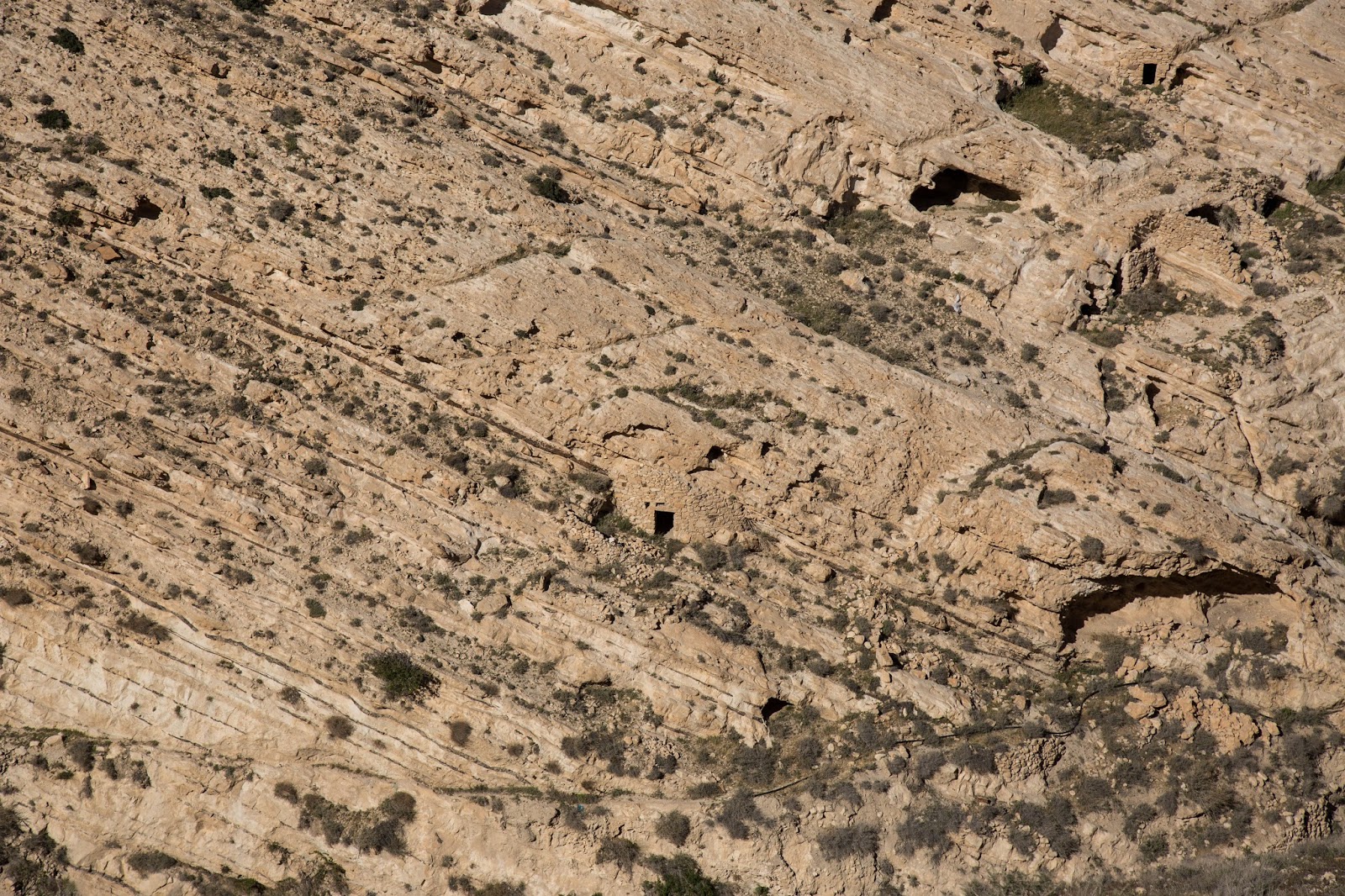 Podemos ver el negro del techo en donde seguramente se utilizaba para cocinar o calentar fuego en las frías noches del desierto. También podemos notar el tipo de «cemento» que se utilizaba en las paredes.