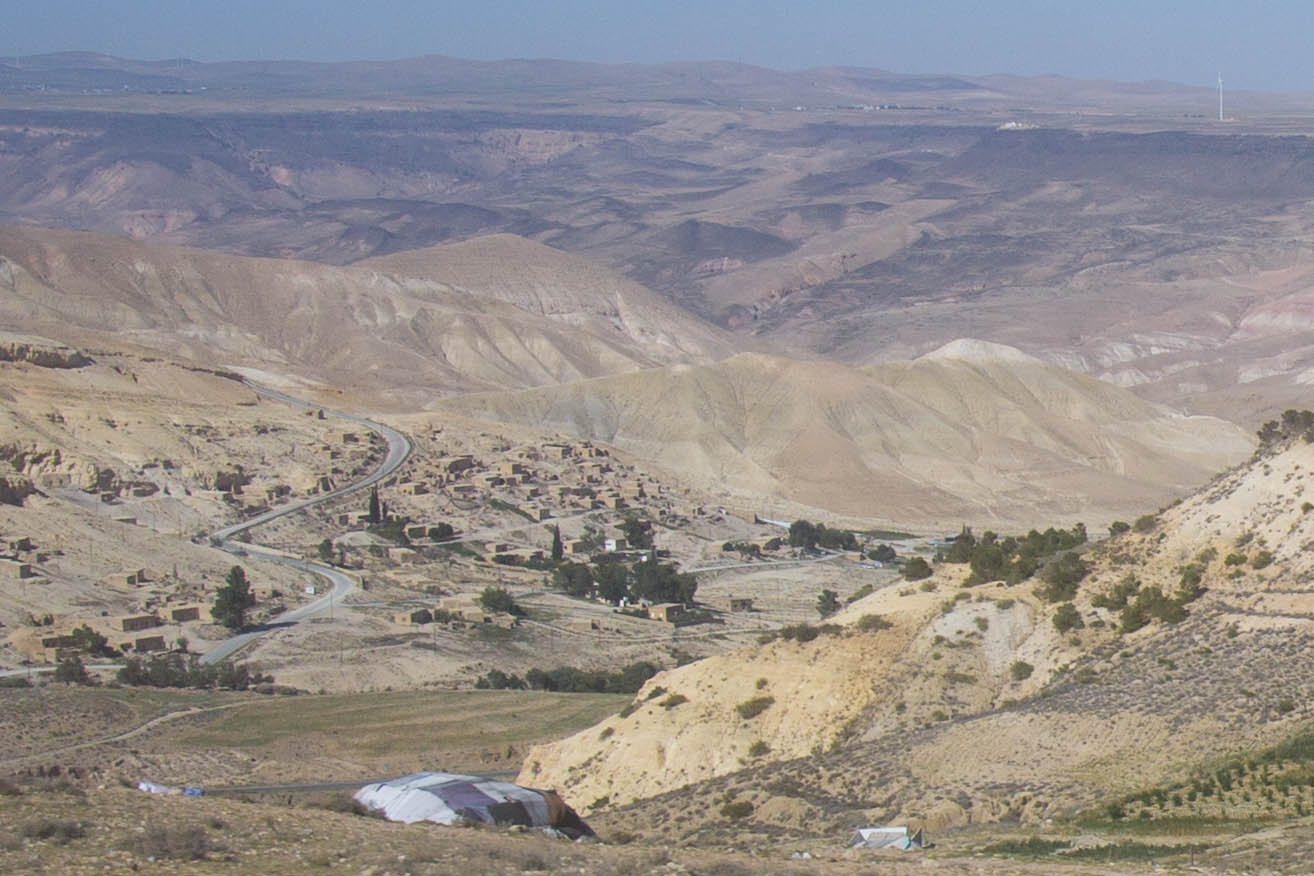 Y luego llegamos a una zona montañosa casi a mitad del país. Como pueden ver la población se ubica en el valle y se puede ver los mechones de verde que indican que hay agua bajo la tierra.