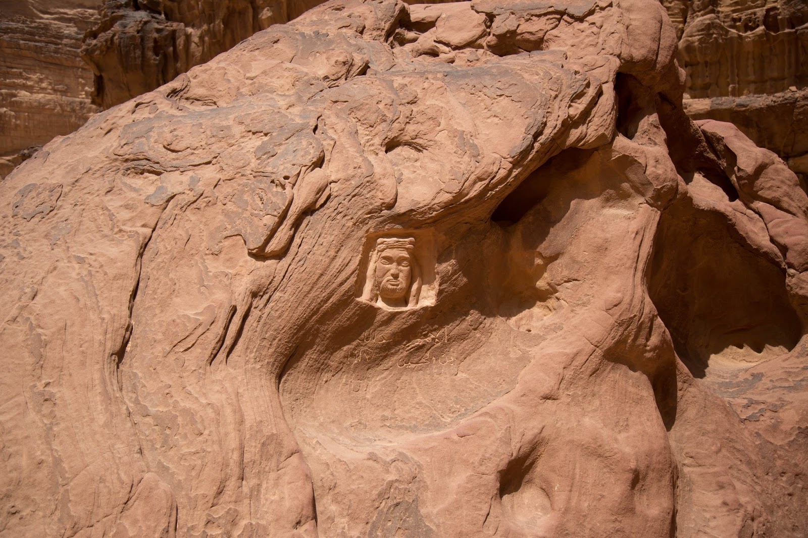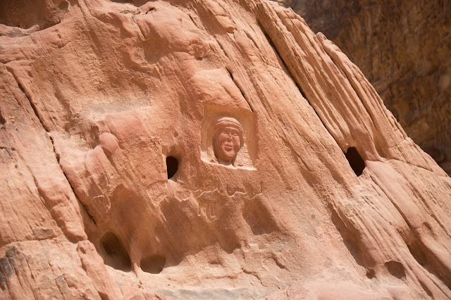 En este sitio encontramos la cara de Lawrence de Arabia tallada en una roca. Nos explican que no es la única y que la mayoría se encuentra en sitios donde se cree que bebió agua, o descansó o durmió, etc.