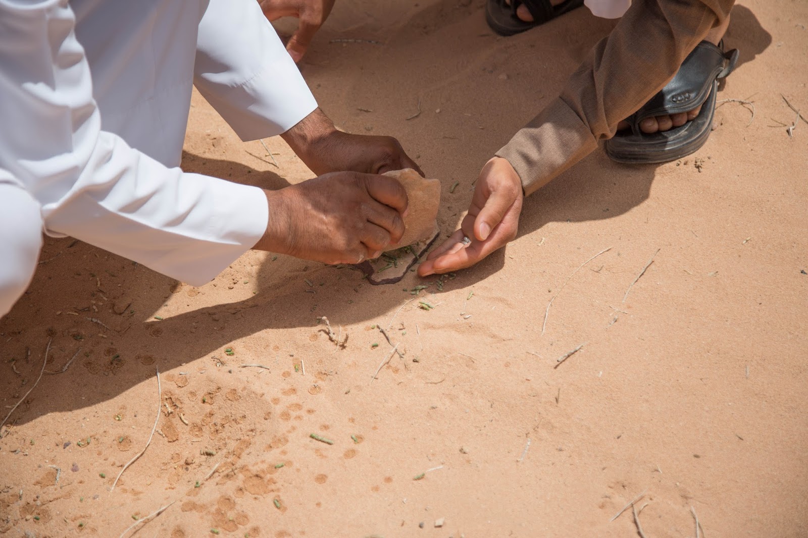 Ajram. Cortamos unas ramitas. Aplastamos las ramitas con piedras y luego agregamos un poco de agua mientras las fregamos en las manos…