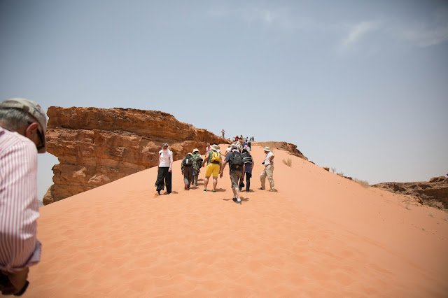 Aqui en Wadi Rum una de las grandes tribus trabaja en cooperación con la organización para encargarse de todo lo que tenga que ver con las actividades turísticas. Manejan los vehículos, organizan las expediciones de escalada o caminatas. Y también traen los dromedarios para pasear con turistas.