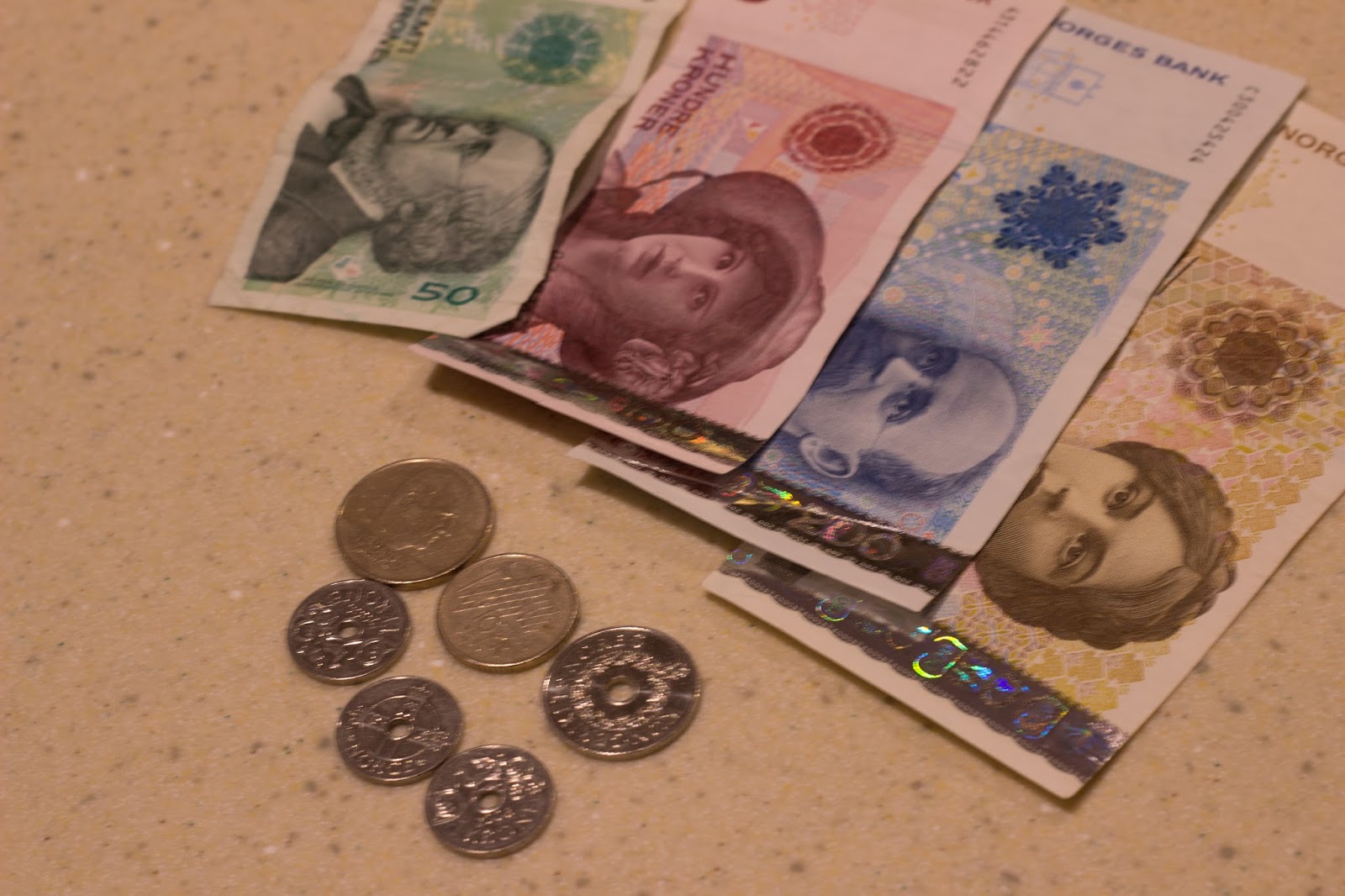 El dinero en Noruega es la Corona Noruega o Krone y se ve así, con monedas de varios tamaños y algunas con agujeros en el medio.