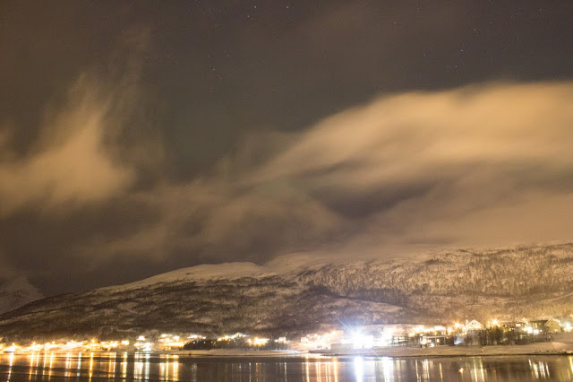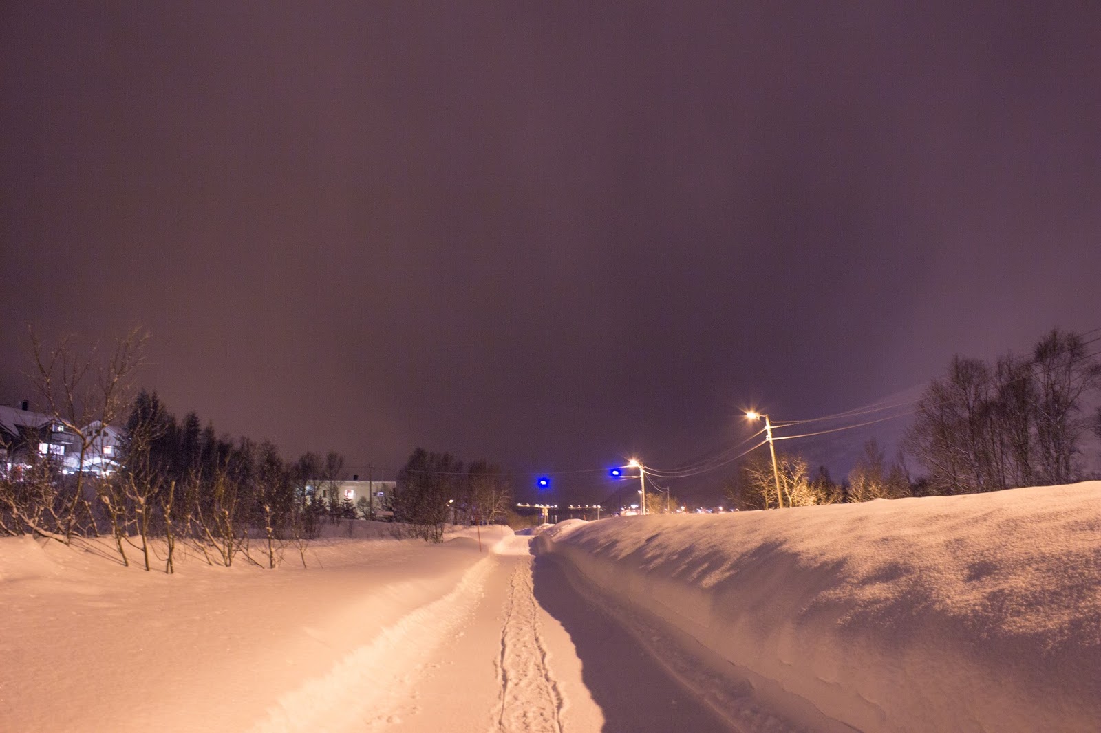 De aquí nos aventuramos a ver las auroras, les cuento lo que pasó. Primero, no teníamos mucha idea de a donde ir, así que desde la última parada de bu, caminamos lo máximo que pudimos buscando un punto oscuro, teniendo en cuenta la hora a la que teníamos que regresar a la estación. Todo muy nublado, perdimos las esperanzas.