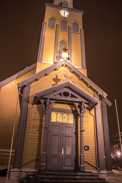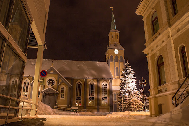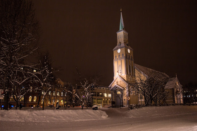 Continuamos recorriendo la ciudad y llegamos a la catedral. Hoy la vemos de noche, pero les prometo que la verán de día así se puede ver esa diferencia que tanto me gusta mostrar, como cambia por completo un paisaje dependiendo de la luz y de la hora. Como Tromsø es relativamente pequeña varias fotos son repetidas, pero algunas son tomadas cuando está nevando, otras de noche y otras de día.