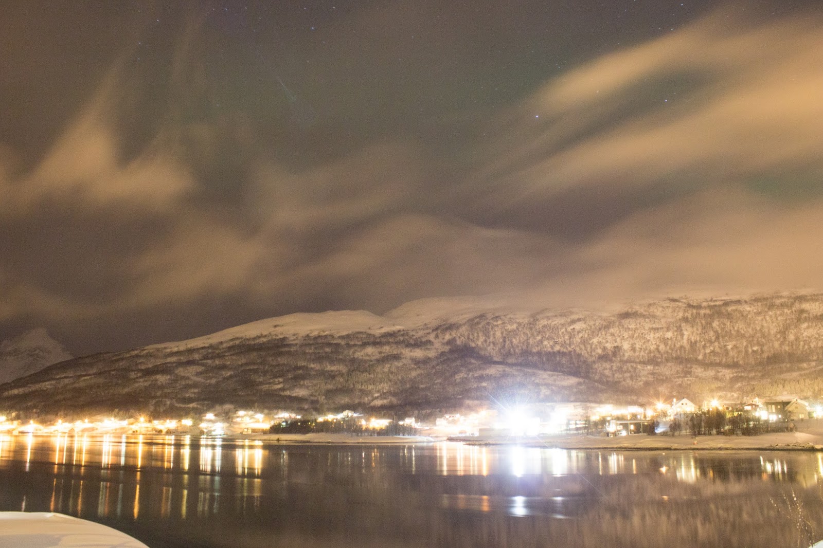 Luego de 10 minutos de caminar llegamos a esta agua que más tarde descubrimos es una de las entradas del mar pues por aquí abundan los fiordos e instalamos el tripode y esperamos, mientras intentaba probar sacar alguna foto, pues era mi primera vez tomando fotos de la aurora boreal. Había leído muchísimo pero hay que practicar un poco para agarrar la mano. Miramos el cielo y de repente se empieza a ver, tomo una foto y AHI ESTABA! VERDE! no podía creer!! La primera foto: un desastre. En eso una señora nos invita a ver mejor desde el balcón de su casa. Se imaginan vivir en una casa donde podes salir a la noche a ver auroras boreales? Que privilegio!