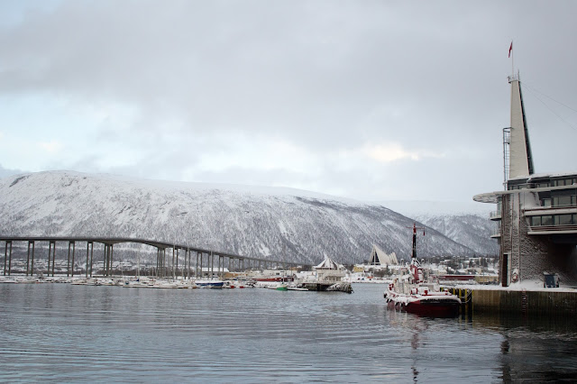 Caminamos al punto más importante de la ciudad, el puerto. Desde donde se puede ver la Catedral del Ártico, que es ese edificio triangular. Allí se llega cruzando el puente, que también se puede ver, y es tambien en esa zona donde se puede tomar el teleférico que nos lleva a la punta de la montaña.