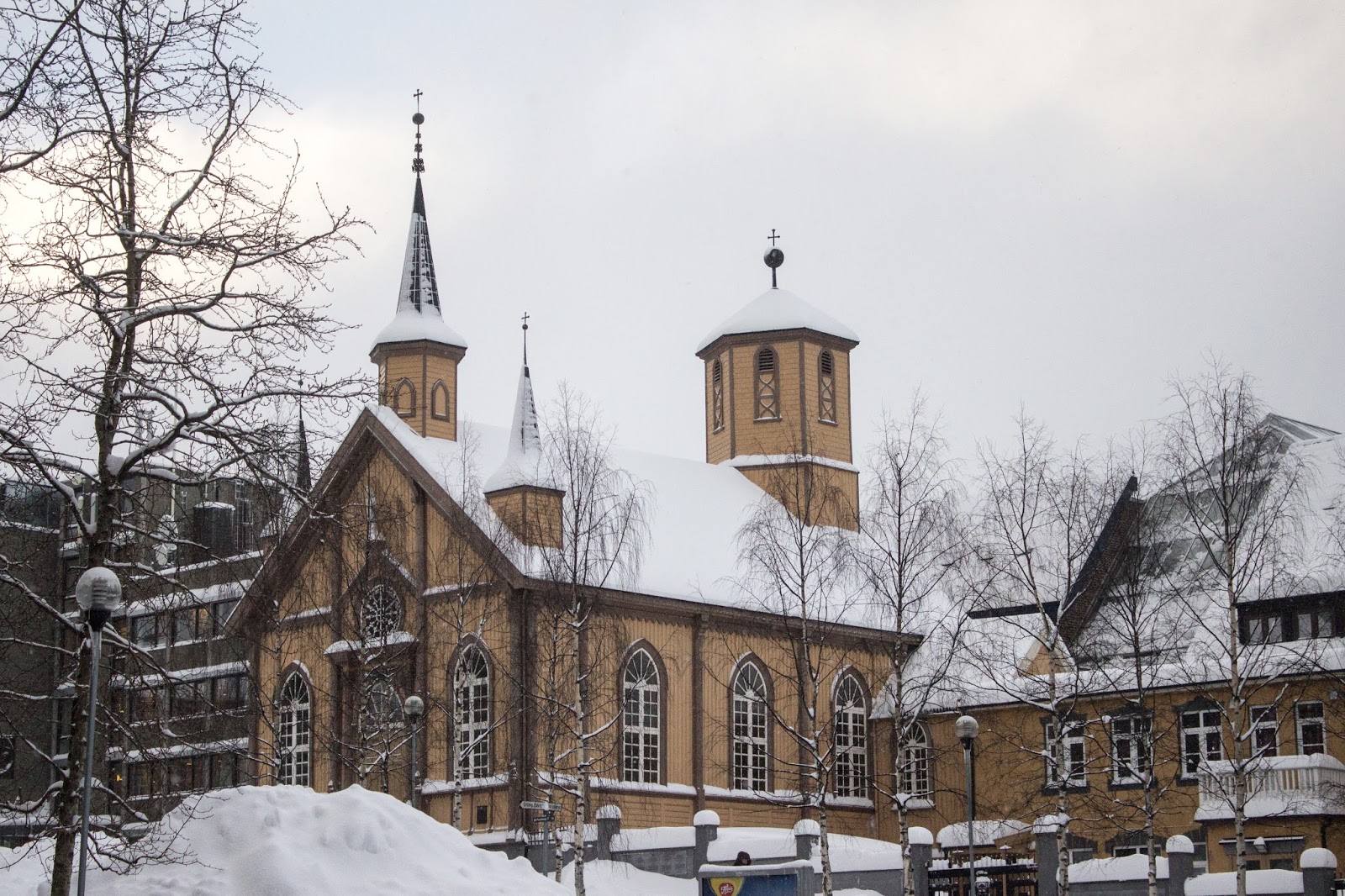 Aquí, la catedral. La única catedral luterana de Noruega enteramente hecha en madera. Construida en 1861 de estilo neogótico esta rodeada de lo que fue una vez un cementerio. Algunas de las tumbas más grandes se pueden ver cuando no hay tanta nieve.