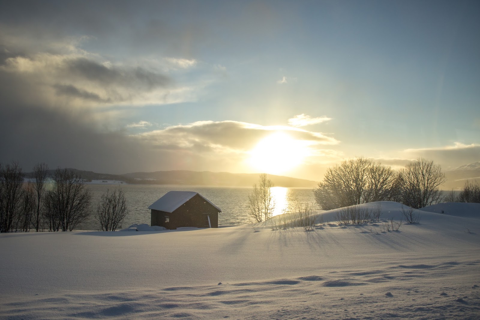 El clima cambia por completo y esto nos preocupa pues con estas nubes es absolutamente imposible ver las luces pero no sabíamos que de verdad la empresa se encarga de recorrer cientos de kilómetros buscando un cielo despejado. Inclusive cruzando la frontera a Suecia si fuese necesario. La foto de abajo corresponde al mismo fiordo, notan el techo de las casas? Pero miramos atrás, donde está la ruta y hay sol. El clima, queda más que claro, es impredecible y cambiante.