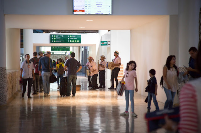 El aeropuerto se encuentra equipado con inmensos ventiladores y un fresco techo de cana. Nos reciben músicos que al son de merengue y bachata nos introducen a este estado vacacional que tiene preparado el lugar.