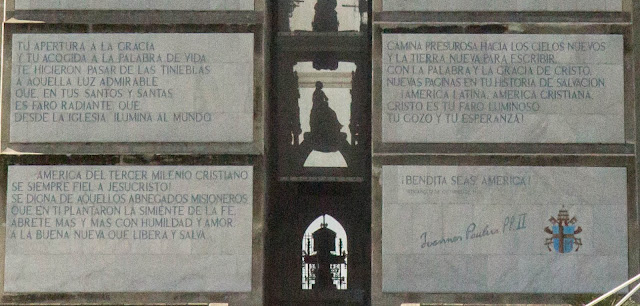 Desde arriba tiene forma de cruz (se puede ver, mas o menos, en la primera y tercera foto), y fue construido en 1986 pero inaugurado el 6 de octubre de 1992 para celebrar los 500 años del descubrimiento de América. Es un monumento, un faro y un museo. Dicen que la luz del faro es tan potente, se puede ver en forma de cruz desde 65 kilometros, y que genera problemas en los barrios cercanos. Por ese motivo solo se prende en eventos especiales.